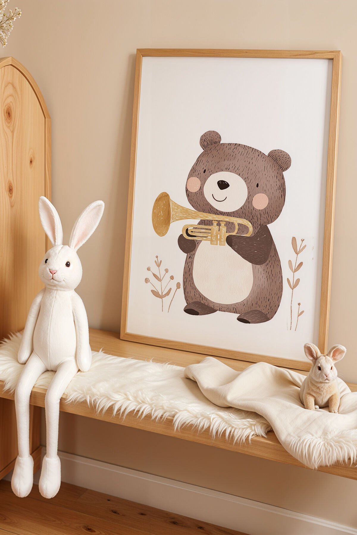 DOĞAL AHŞAP - Sevimli Müzik Çalan Ayı – Doğal Ahşap Çerçeveli Çocuk Odası Tablosu