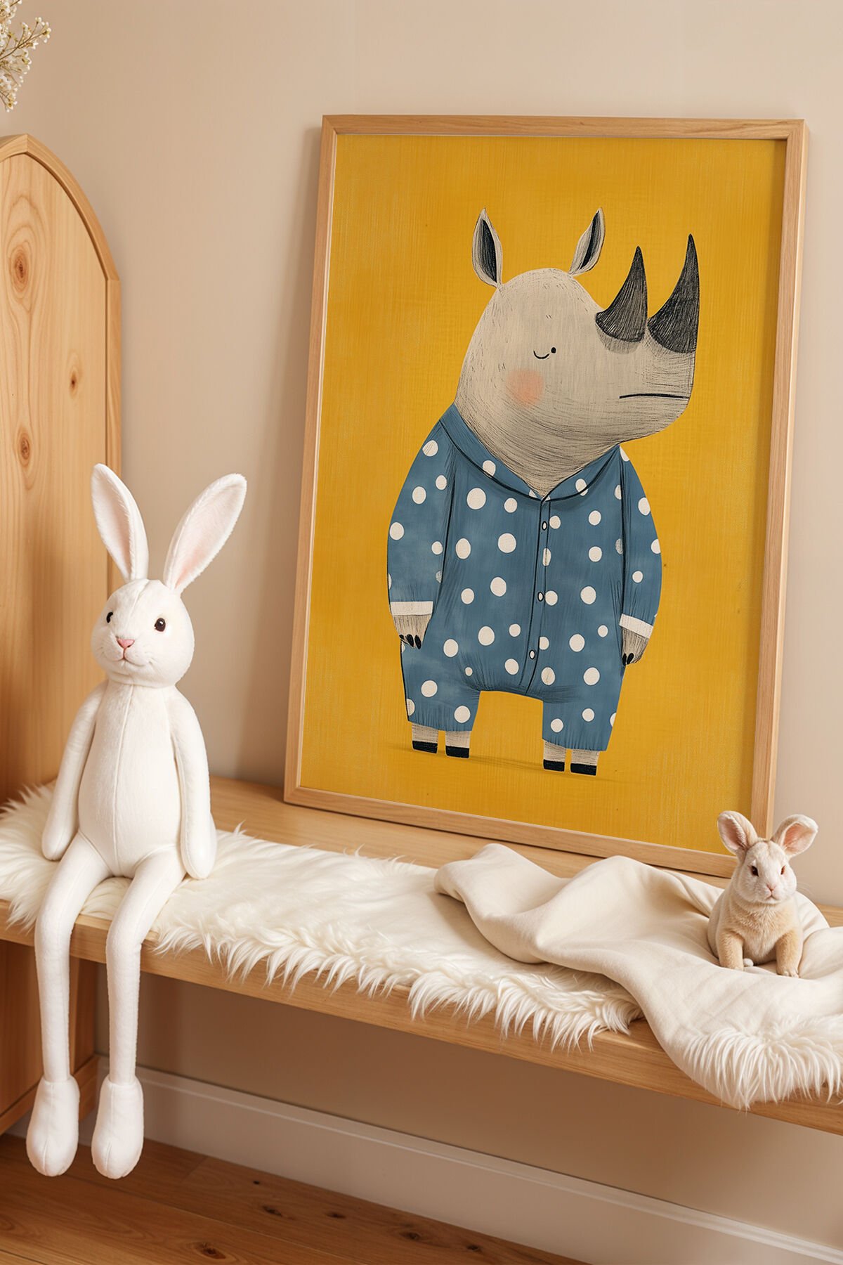 DOĞAL AHŞAP - Sevimli Pijamalı Gergedan Çocuk Odası Ve Bebek Odası Ahşap Çerçeveli Duvar Tablosu