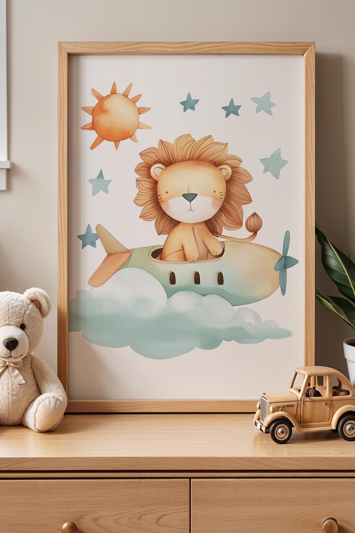 DOĞAL AHŞAP - Sevimli Pilot Aslan Çocuk Odası Ahşap Çerçeveli Duvar Tablosu