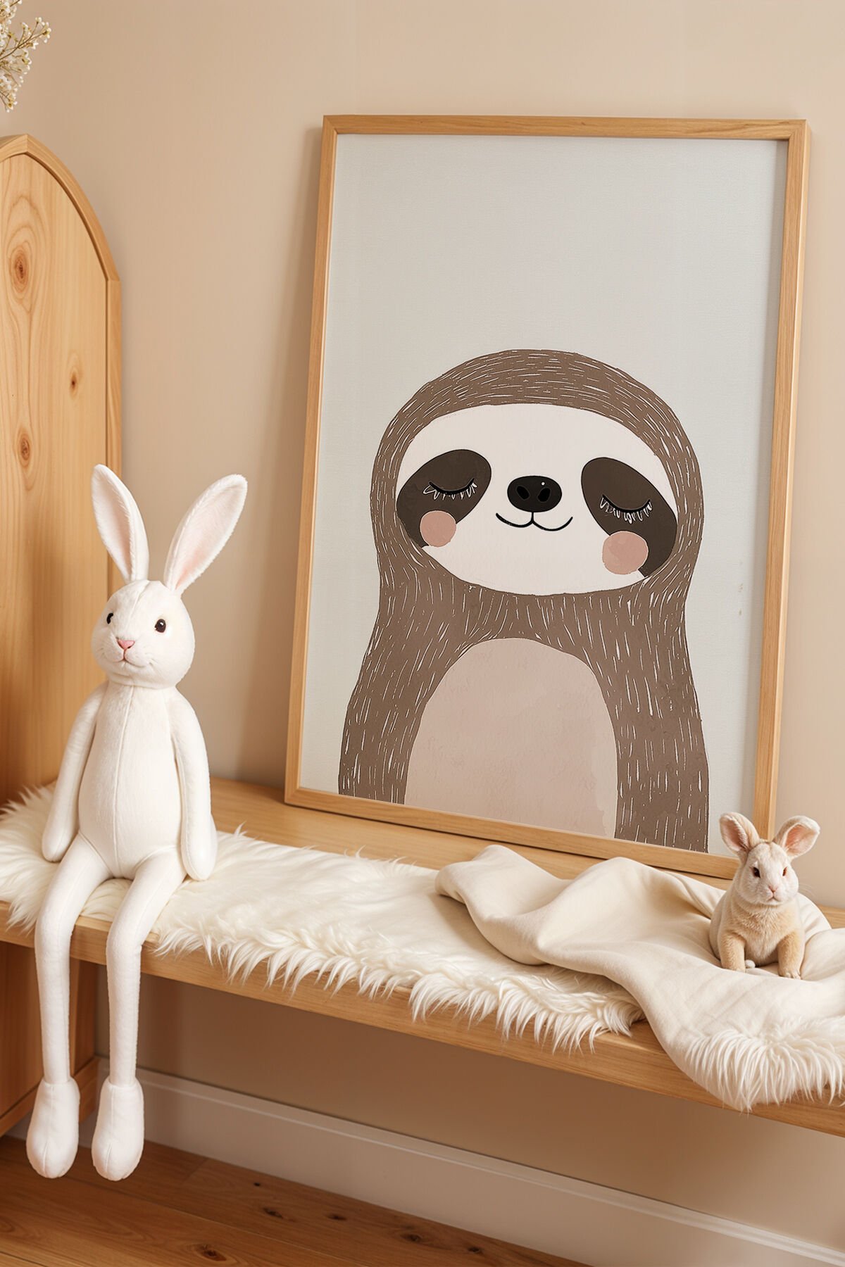 DOĞAL AHŞAP - Sevimli Tembel Hayvan – Doğal Ahşap Çerçeveli Çocuk Odası Tablosu
