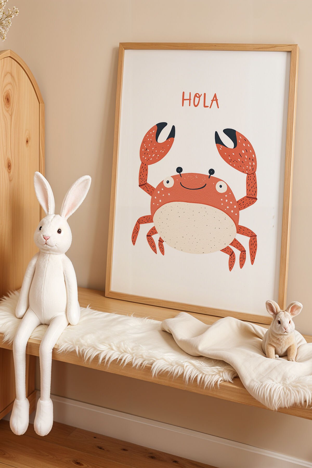 DOĞAL AHŞAP - Sevimli Yengeç ve Deniz Dünyası - Doğal Ahşap Çerçeveli Çocuk ve Bebek Odası Tablosu