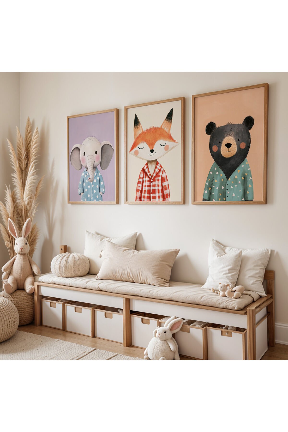 DOĞAL AHŞAP - Şık ve Sevimli Dostlar – Fil, Tilki ve Ayı Temalı Çocuk Odası Doğal Ahşap Çerçeveli Tablo Seti