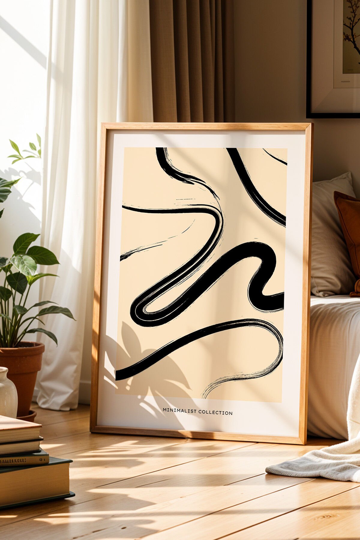 DOĞAL AHŞAP - Simplicity Bohem Minimalist Bej Doğal Ahşap Çerçeveli Duvar Tablosu