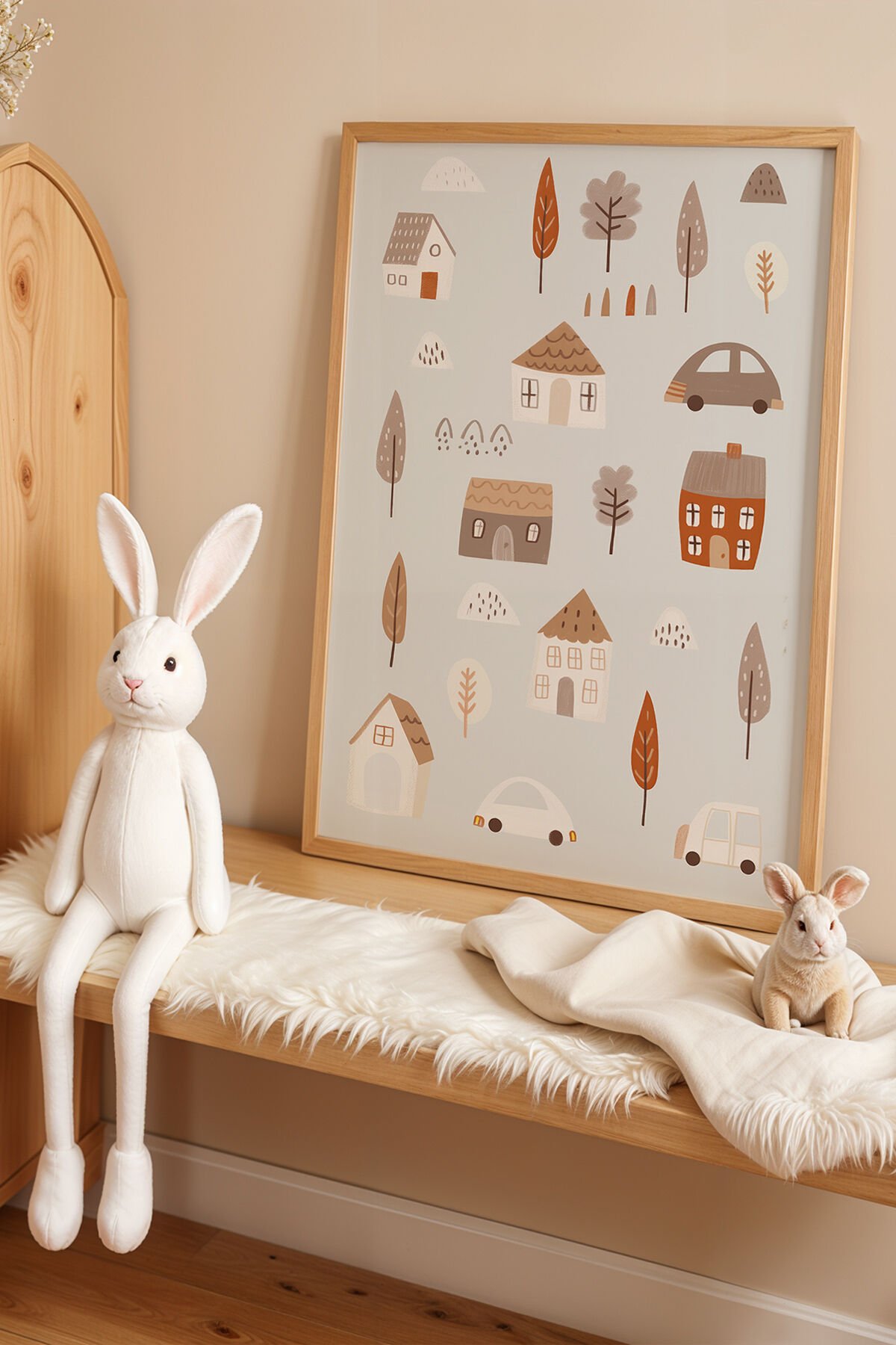 DOĞAL AHŞAP - Şirin Kasaba Manzarası - Doğal Ahşap Çerçeveli Çocuk ve Bebek Odası Tablosu