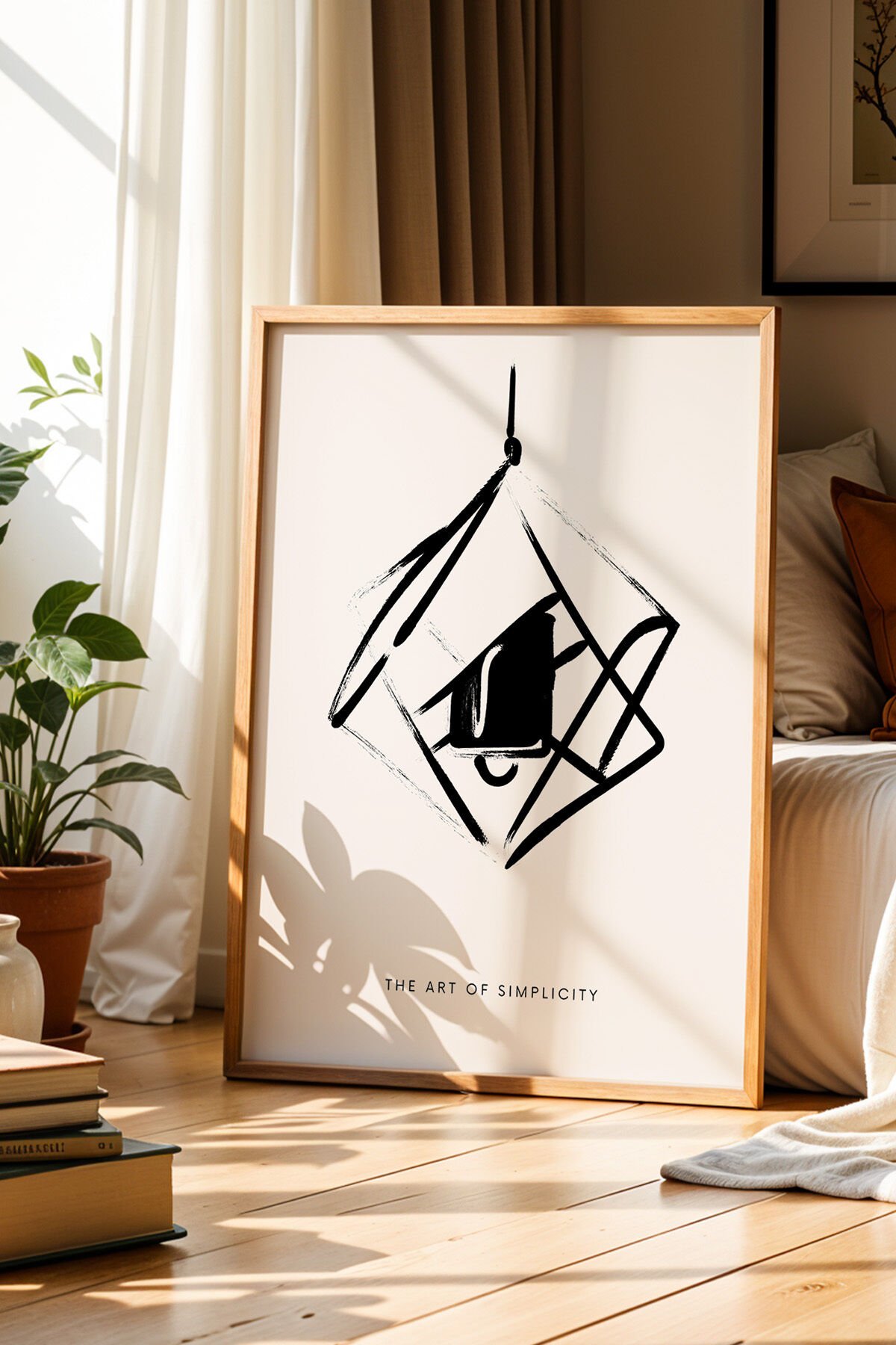 DOĞAL AHŞAP - Siyah Beyaz Avize Çizim Minimalist Bohem Doğal Ahşap Çerçeveli Duvar Tablosu
