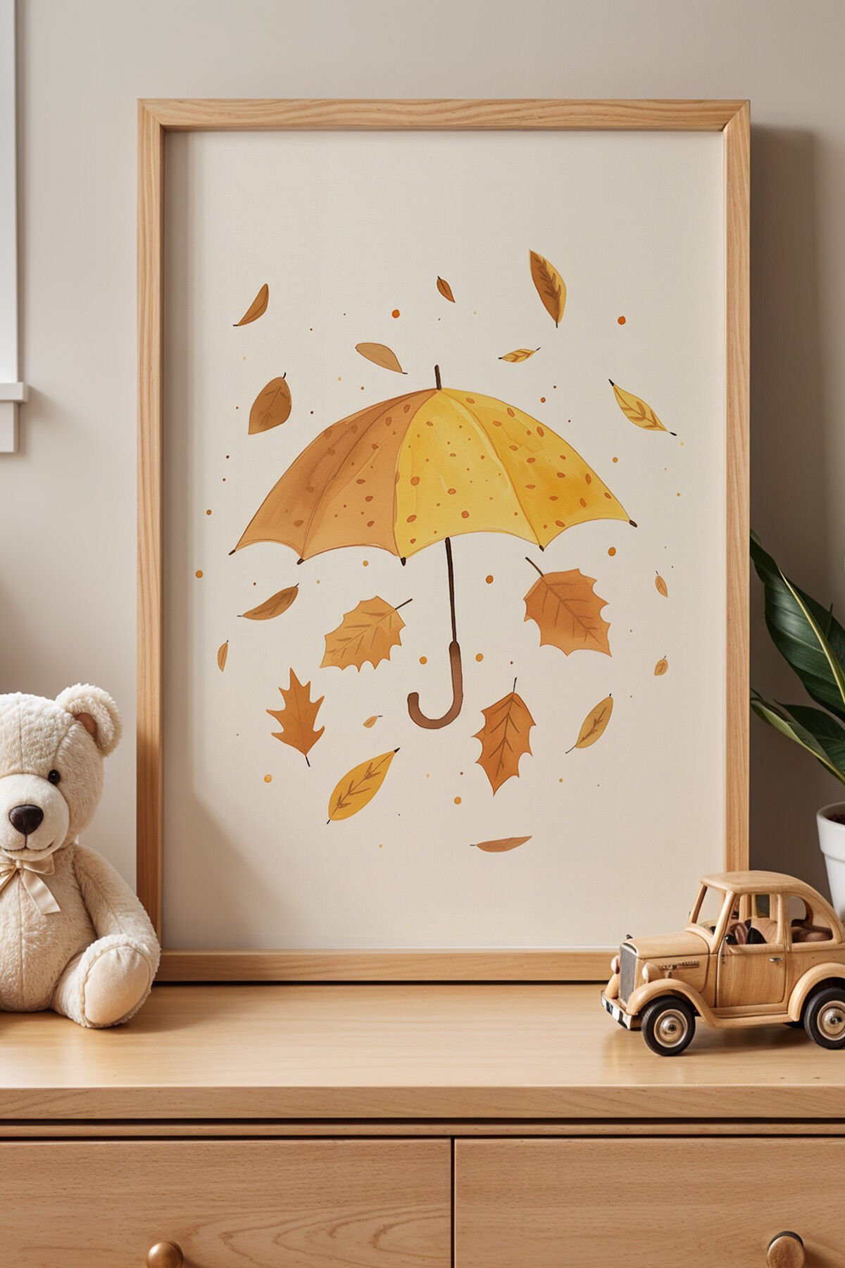 DOĞAL AHŞAP - Sonbahar Şemsiyesi Doğal Ahşap Çerçeveli Çocuk Odası Tablosu