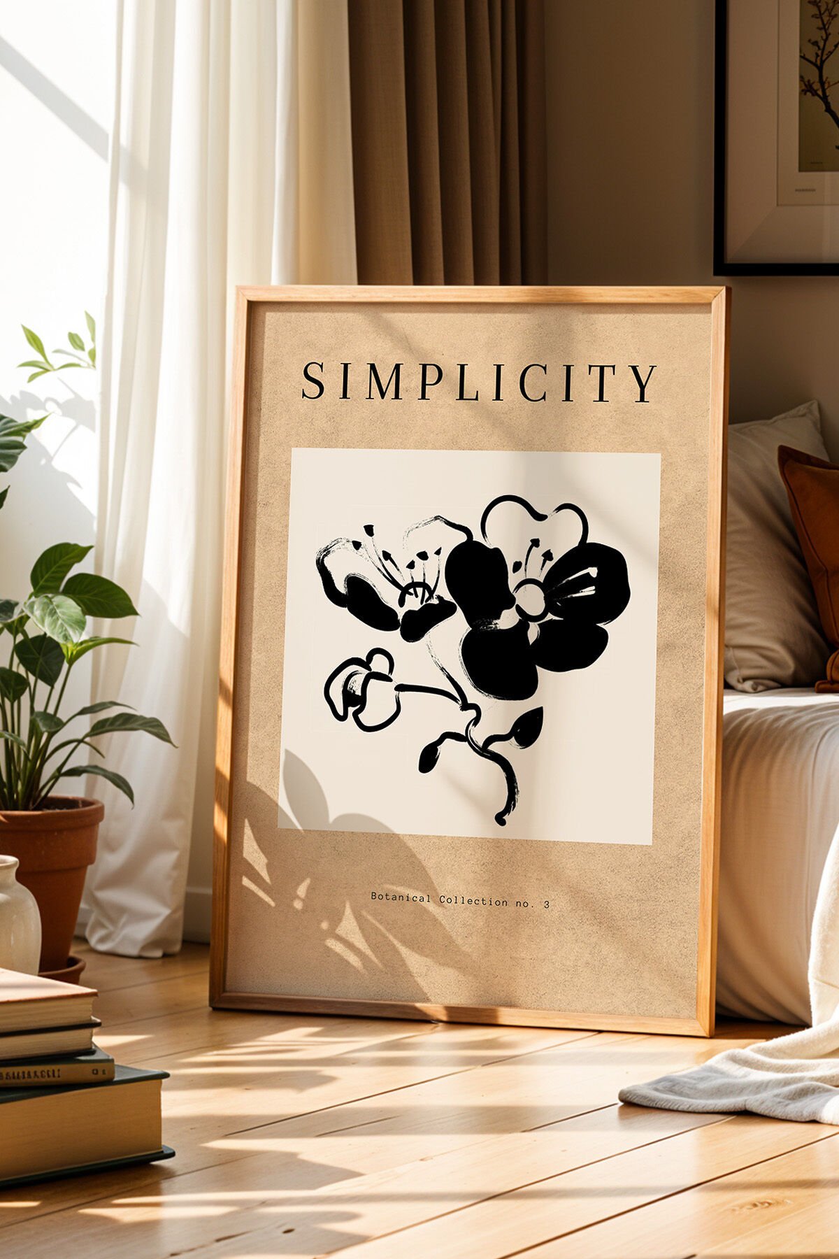 DOĞAL AHŞAP - Soyut Botanik Çizim Kahverengi Minimalist Doğal Ahşap Çerçeveli Duvar Tablosu