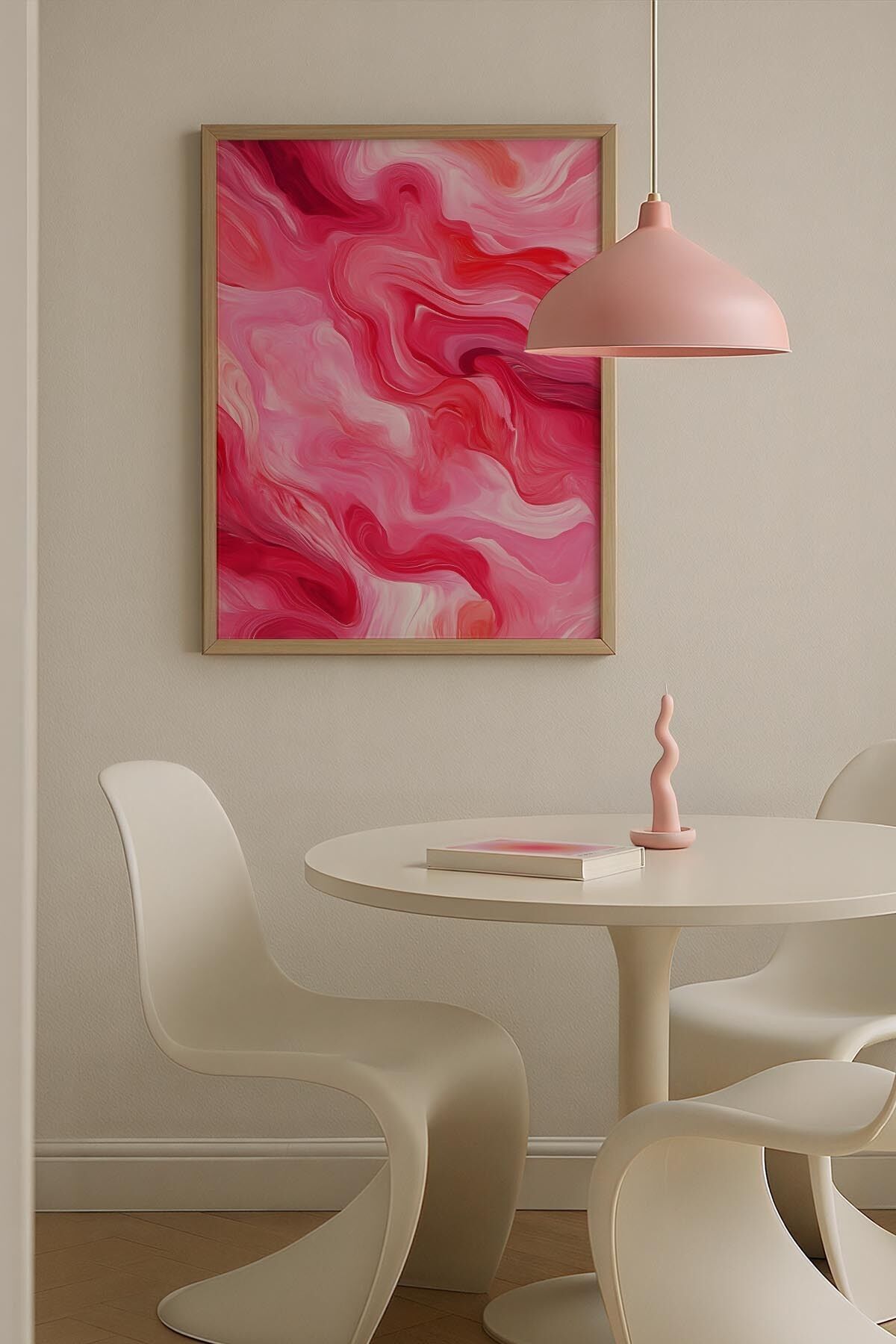 DOĞAL AHŞAP - Soyut Dalgalar Pembe Estetik Trendy Maksimalist Sanatı Ahşap Çerçeveli Duvar Tablosu