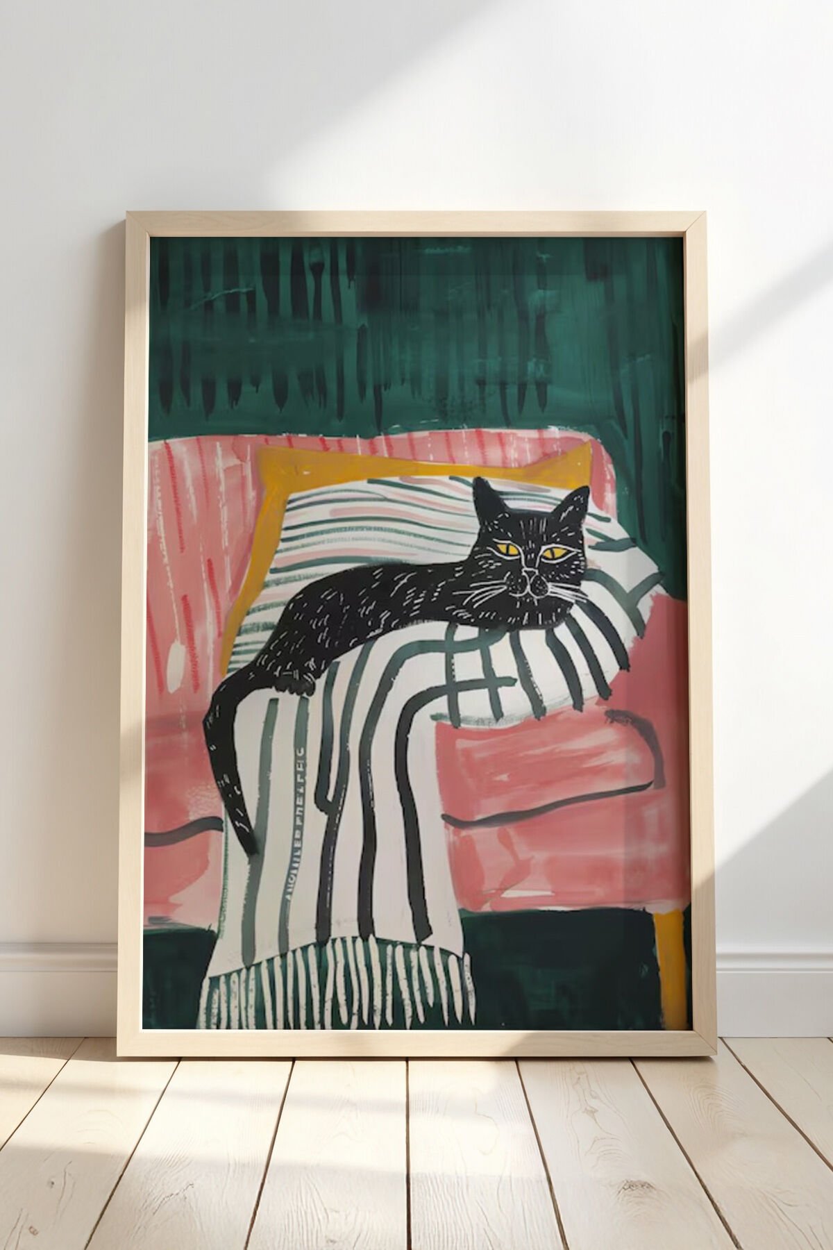 DOĞAL AHŞAP - Soyut Kedi Sanatı Ahşap Çerçeveli Duvar Kedi Tablosu