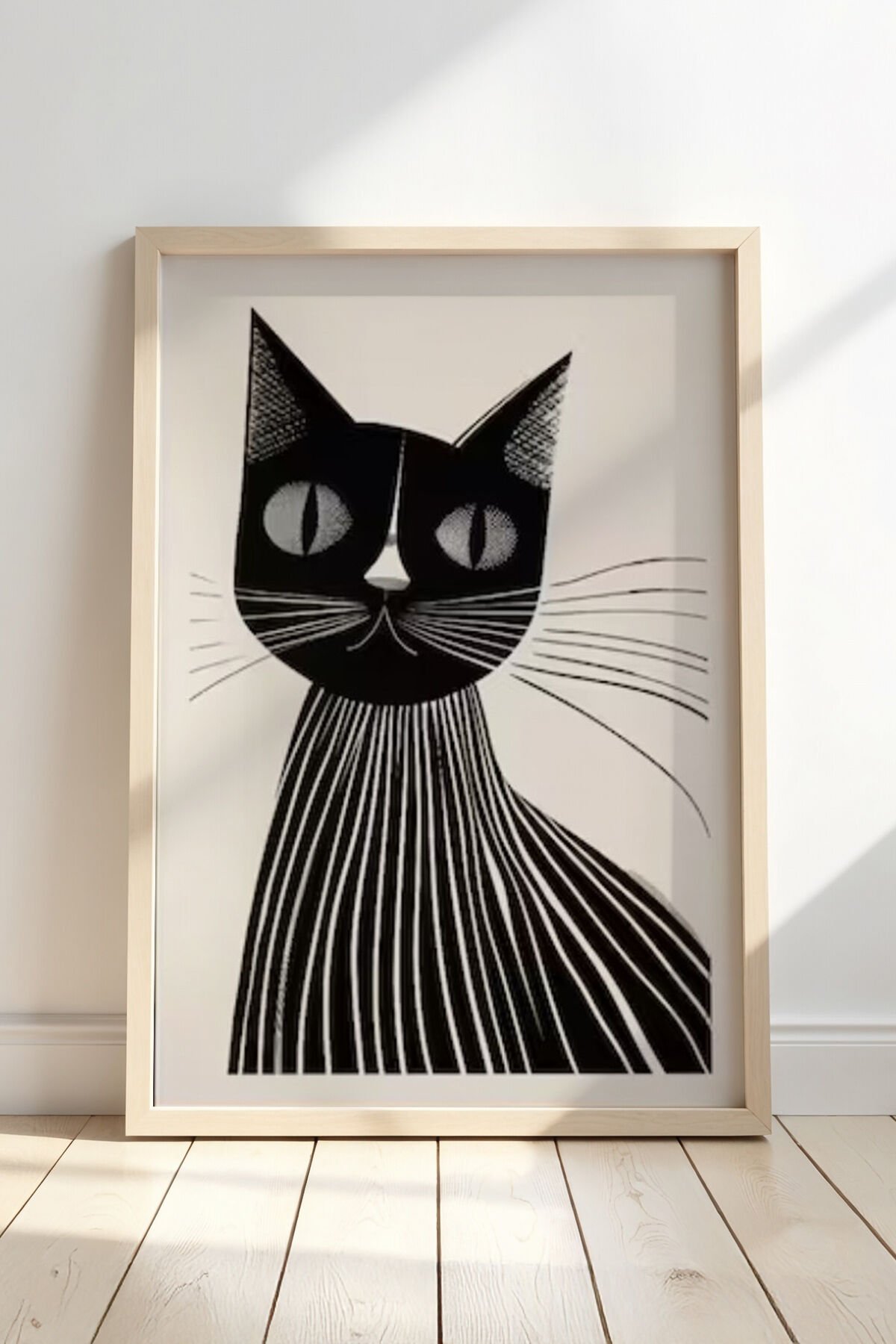 DOĞAL AHŞAP - Soyut Kedi Sanatı Ahşap Çerçeveli Duvar Tablosu
