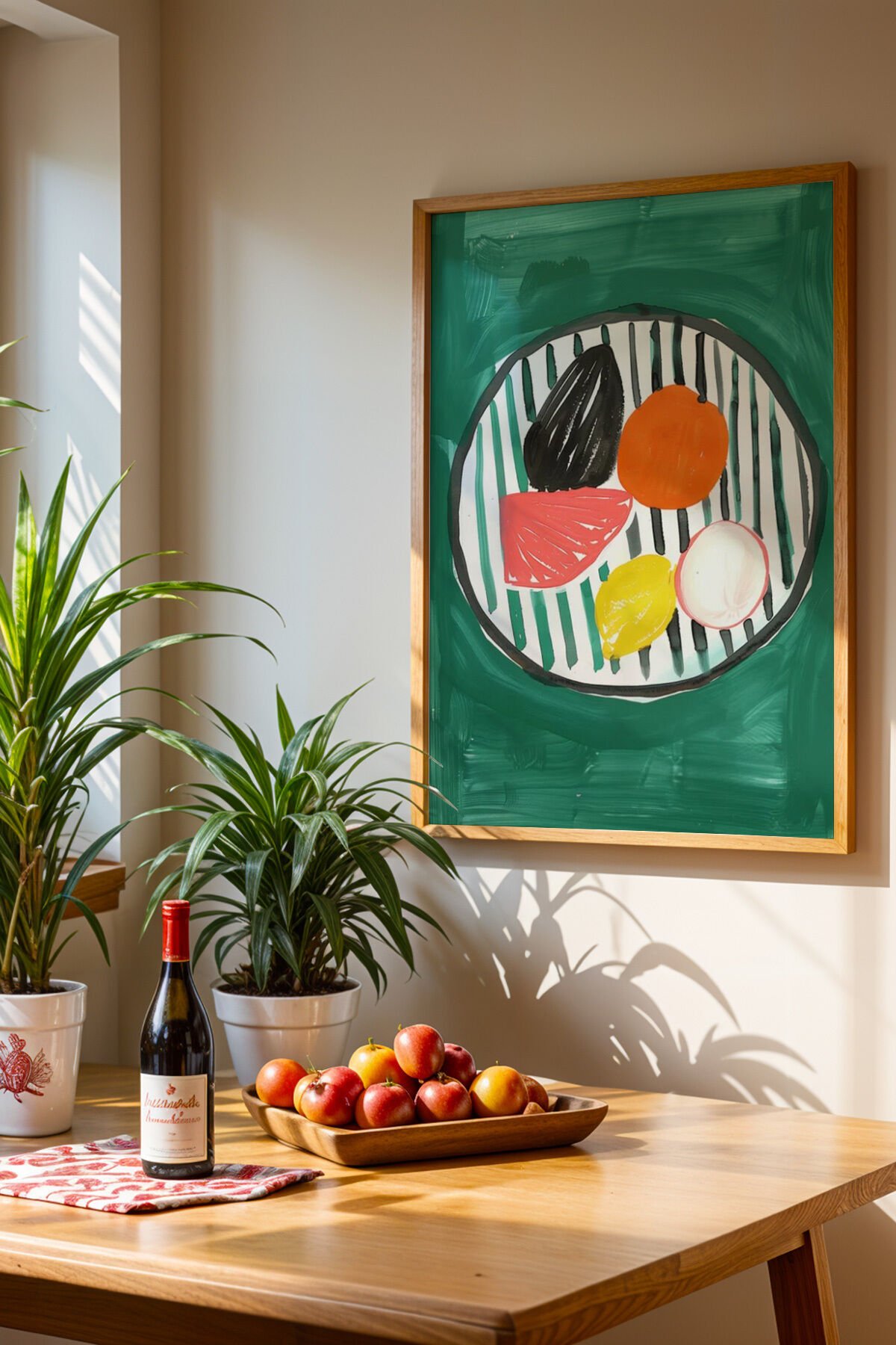 DOĞAL AHŞAP - Soyut Meyve Kasesi Sanat Baskısı Ahşap Çerçeveli Mutfak Duvar Tablosu