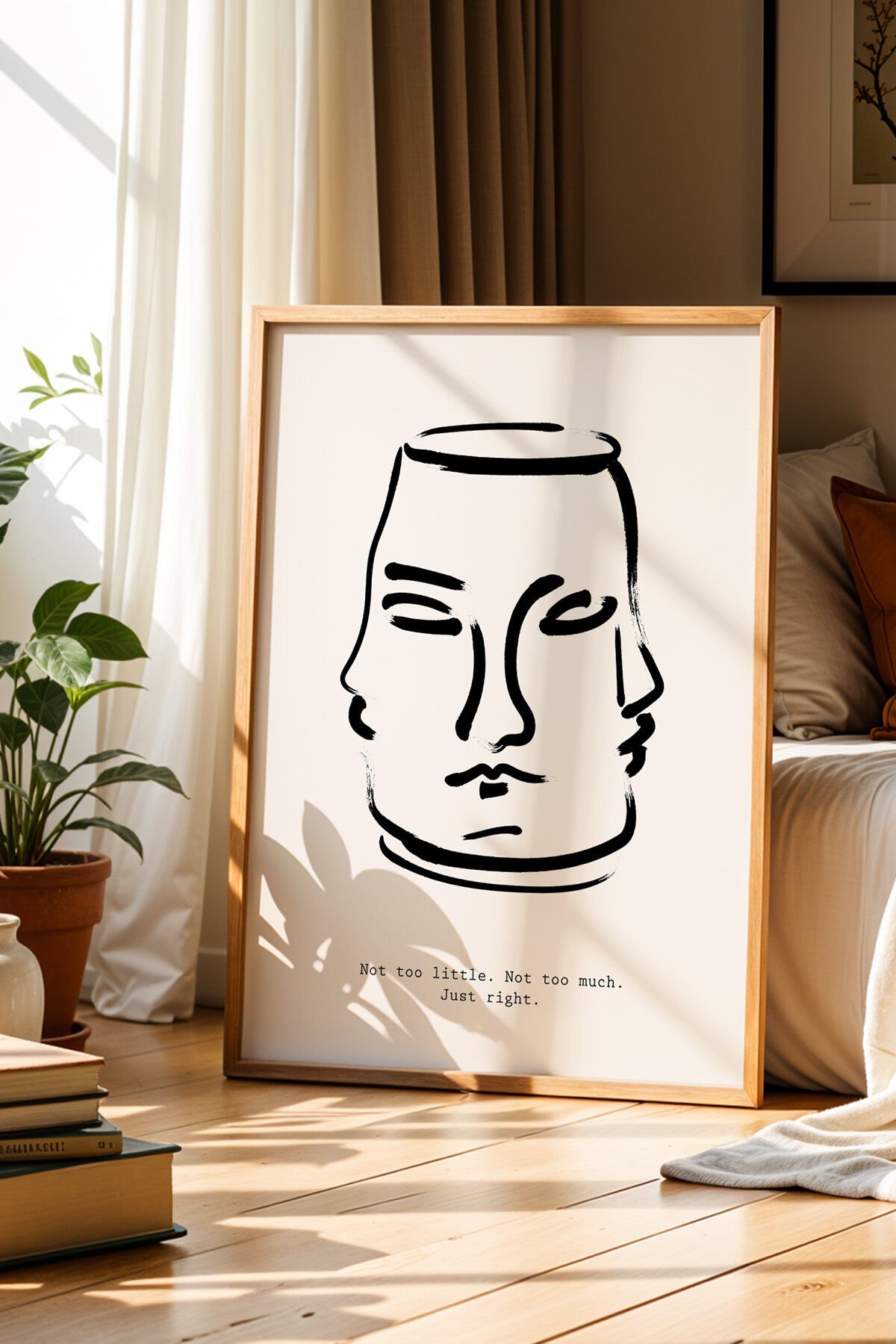 DOĞAL AHŞAP - Soyut Yüz Minimalist Çizim Kahverengi Bohem Doğal Ahşap Çerçeveli Duvar Tablosu