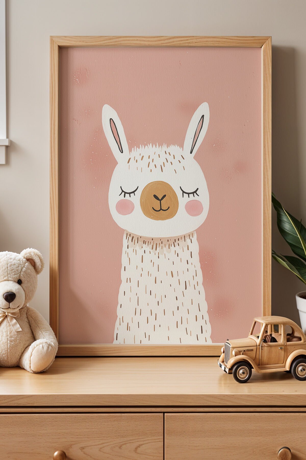 DOĞAL AHŞAP - Tatlı Lama ve Pembe Fon – Doğal Ahşap Çerçeveli Çocuk Odası Tablosu
