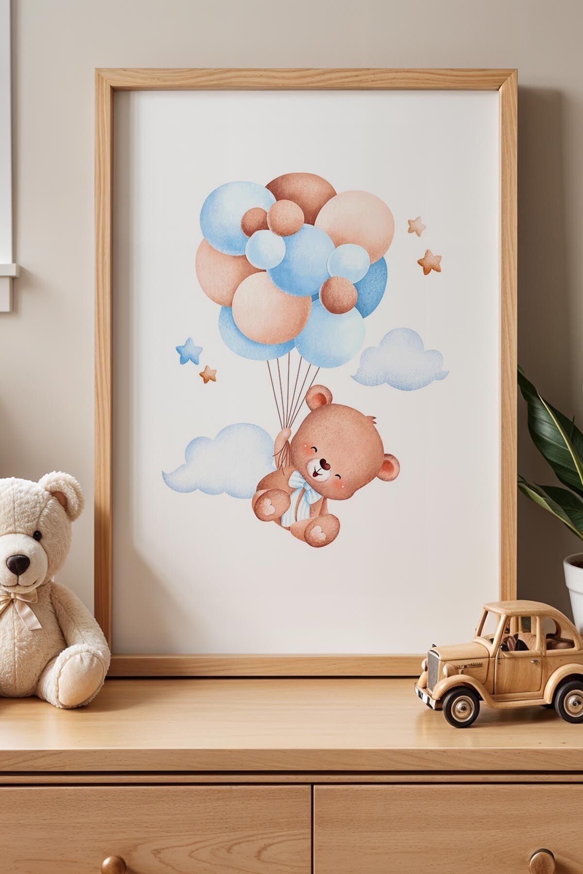 DOĞAL AHŞAP - Uçan Ayıcık ile Balonlar Çocuk Odası Ahşap Çerçeveli Duvar Tablosu