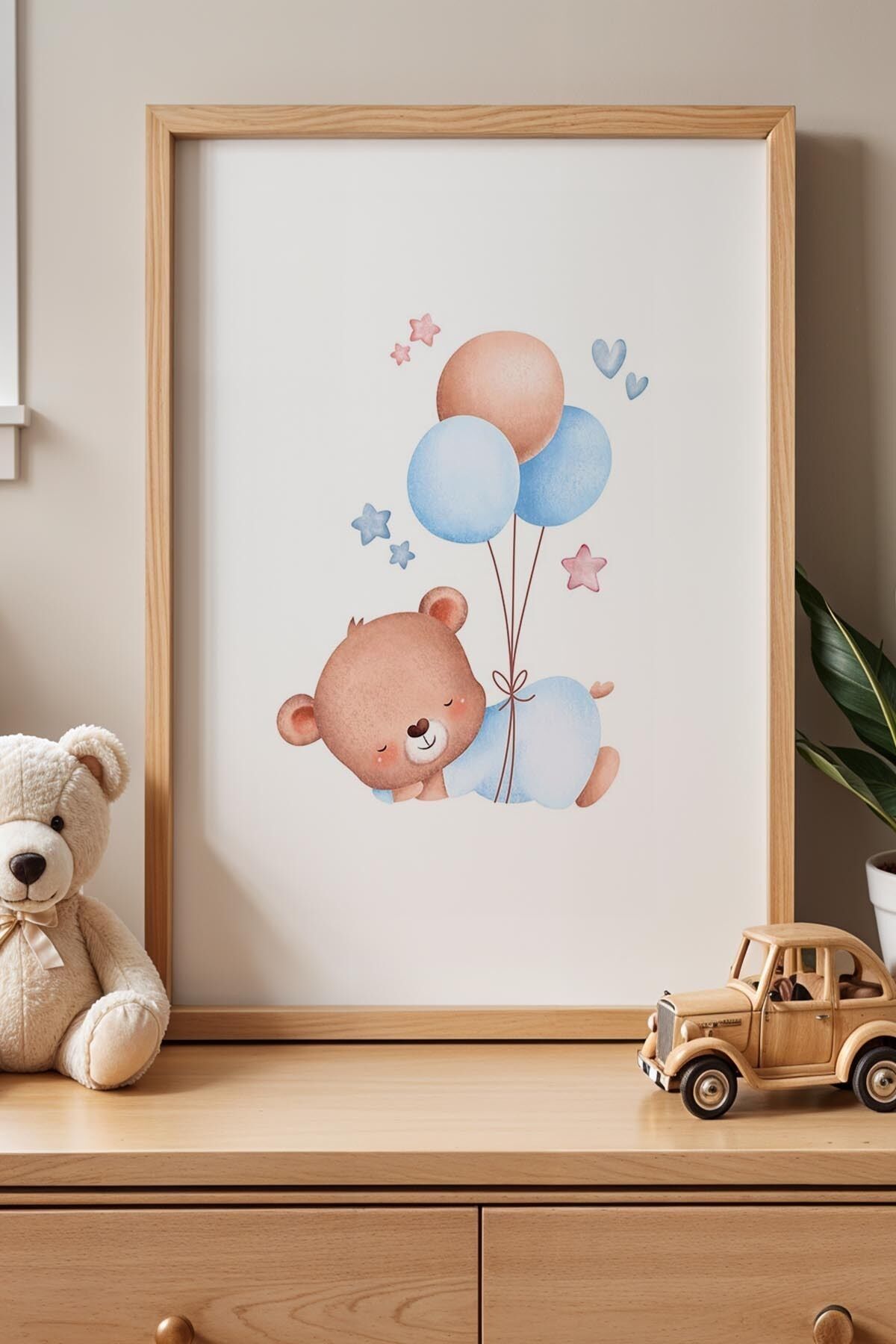 DOĞAL AHŞAP - Uçan Ayıcık ile Balonlar Çocuk Odası Ahşap Çerçeveli Duvar Tablosu