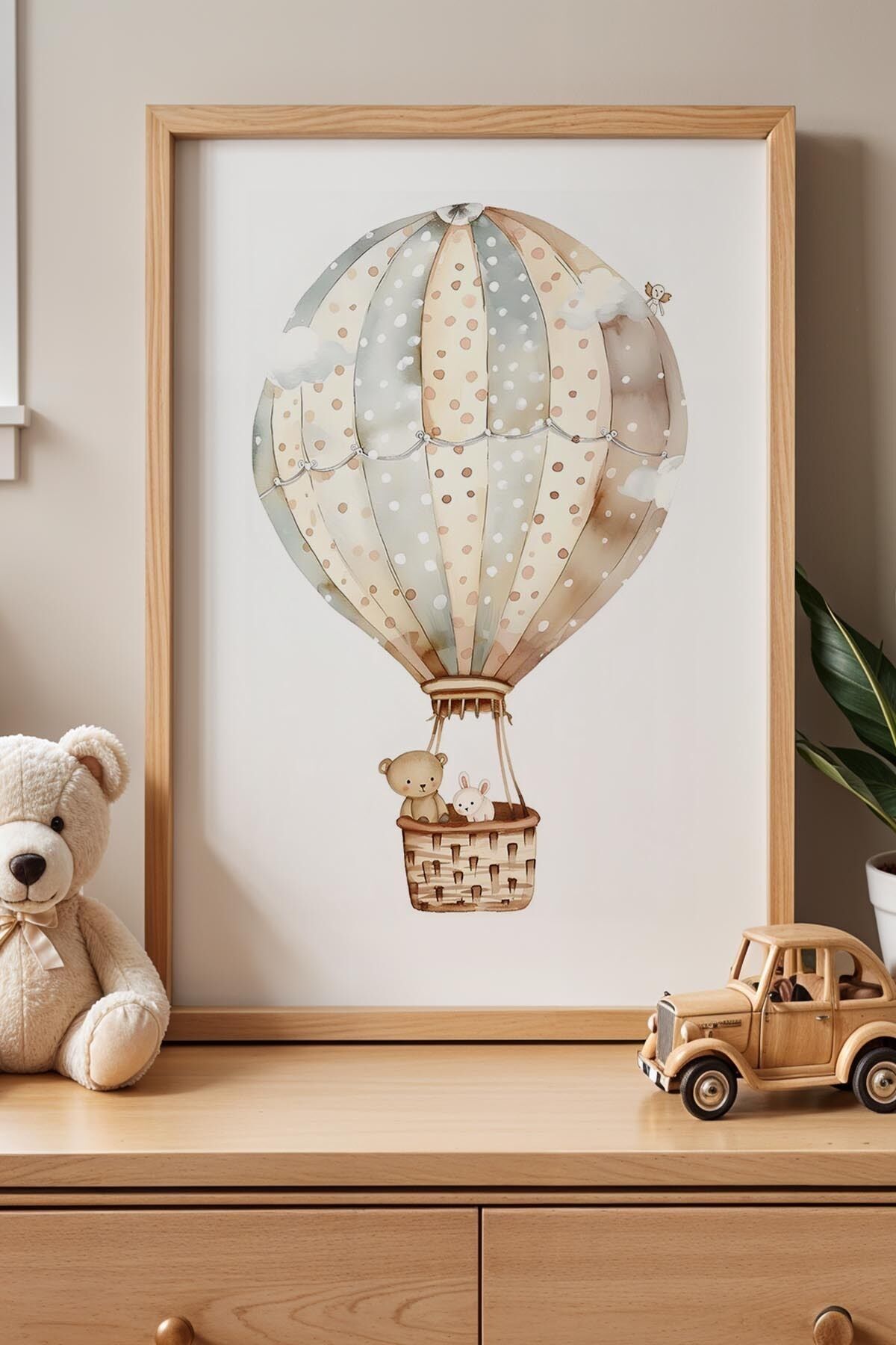 DOĞAL AHŞAP - Uçan Balonda Ayıcık Ve Tavşan Çocuk Odası Ahşap Çerçeveli Duvar Tablosu