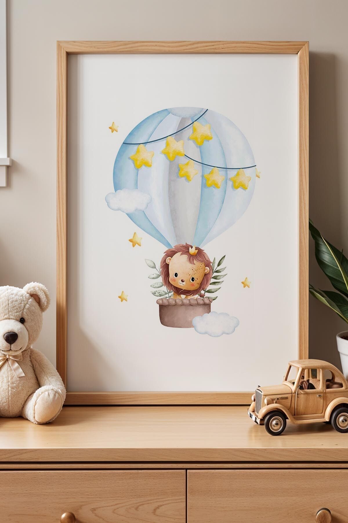 DOĞAL AHŞAP - Uçan Balonlu Aslan Çocuk Odası Ahşap Çerçeveli Duvar Tablosu