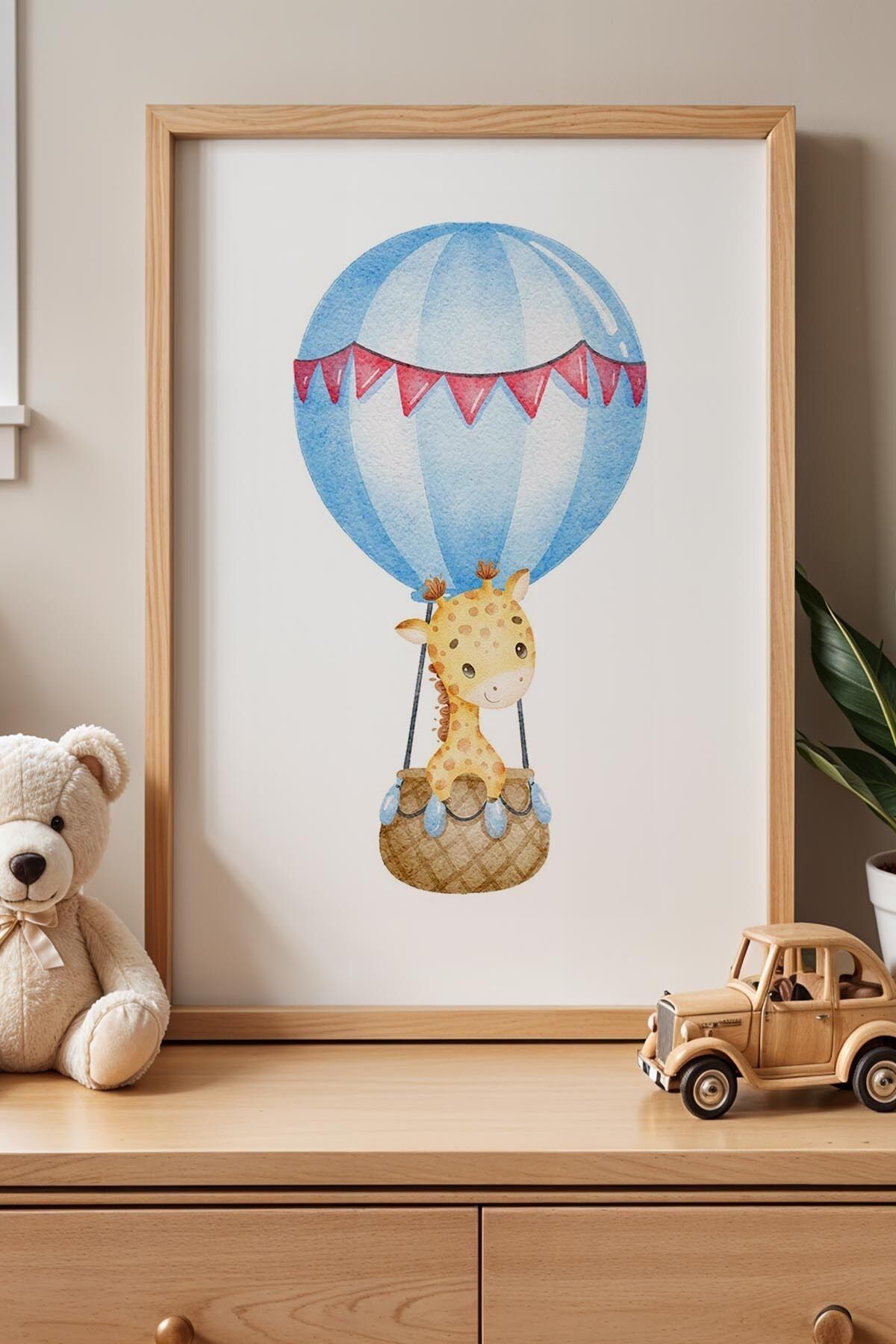 DOĞAL AHŞAP - Uçan Balonlu Zürefa Çocuk Odası Ahşap Çerçeveli Duvar Tablosu