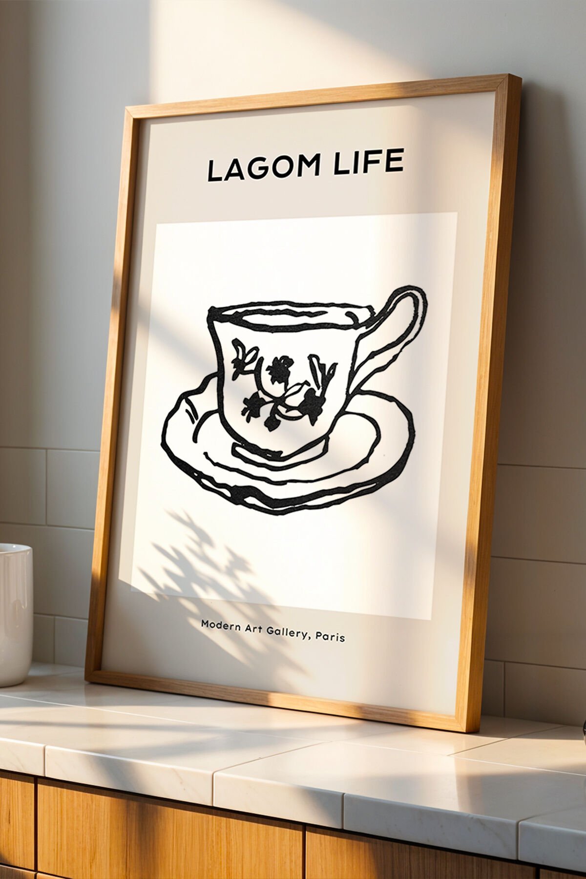 DOĞAL AHŞAP - Vintage Fincan Çizimi Doğal Ahşap Çerçeveli Bohem Mutfak Duvar Tablosu
