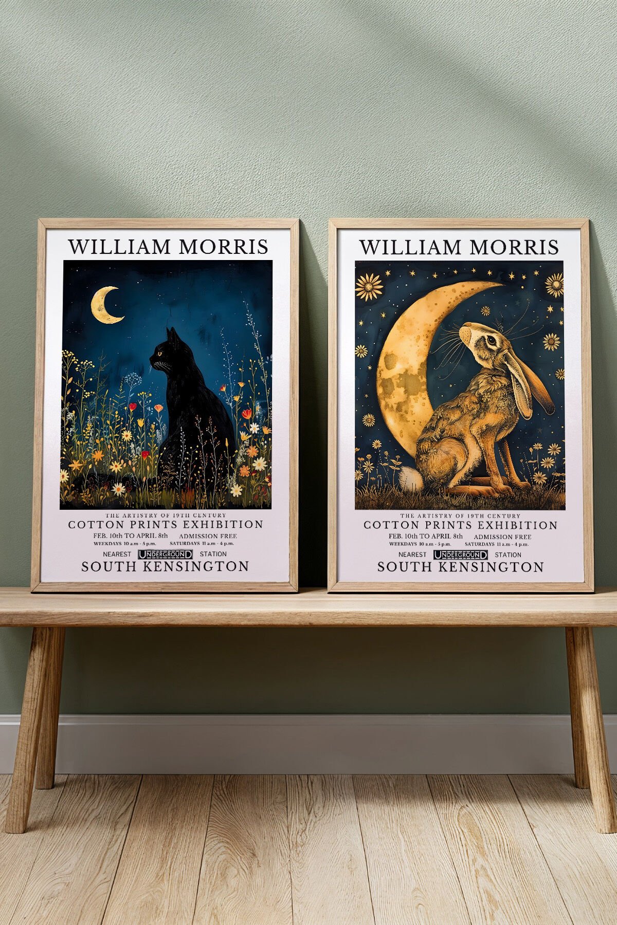 DOĞAL AHŞAP - William Morris Premium Vintage - Gece ve Ay Işığında Kara Kedi Doğal Ahşap Çerçeveli Tablo