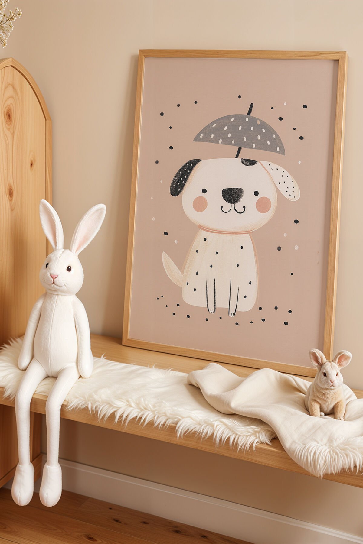 DOĞAL AHŞAP - Yağmurda Şirin Köpek - Doğal Ahşap Çerçeveli Çocuk ve Bebek Odası Tablosu