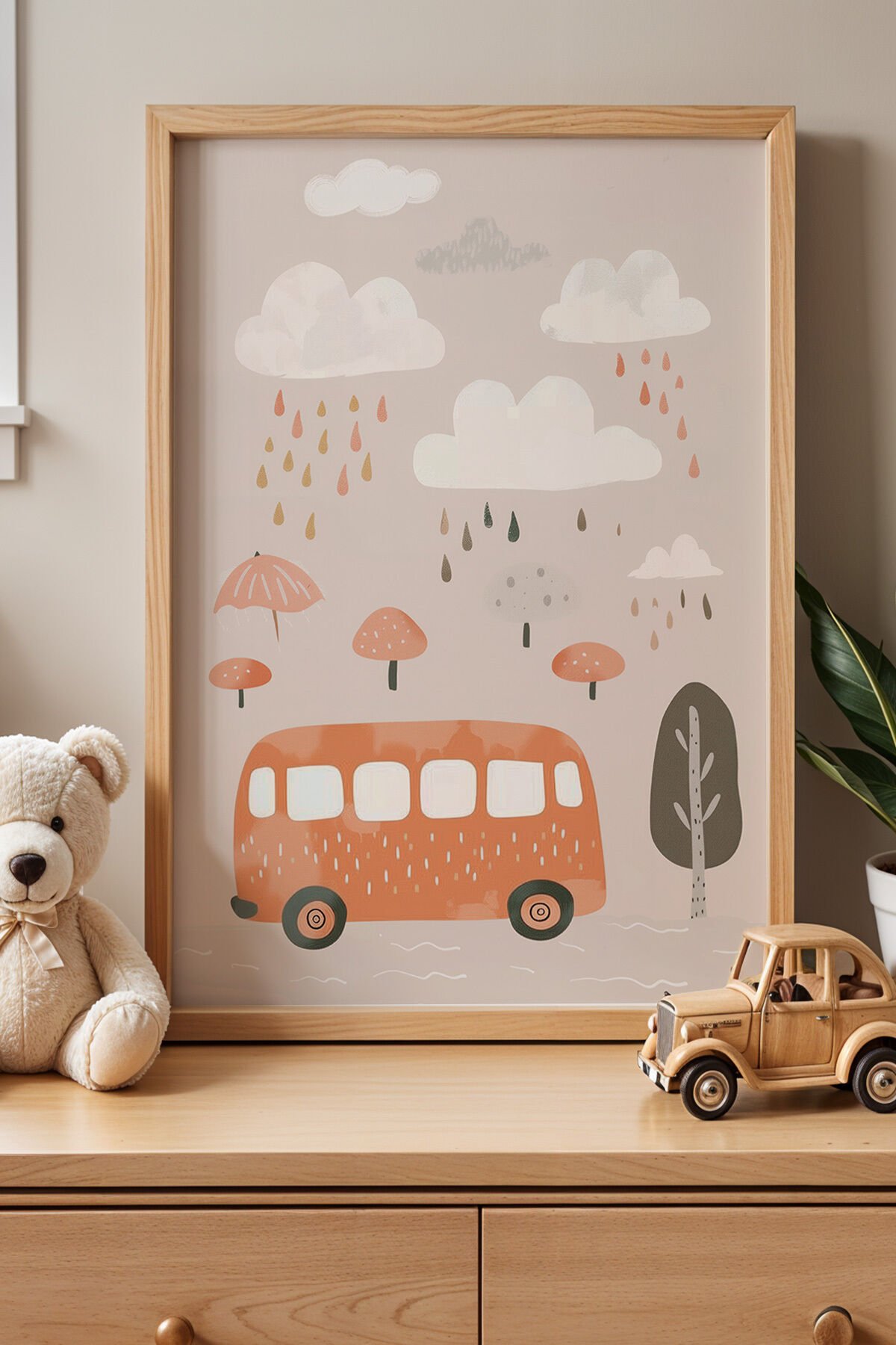 DOĞAL AHŞAP - Yağmurlu Gün ve Turuncu Otobüs - Doğal Ahşap Çerçeveli Çocuk ve Bebek Odası Tablosu