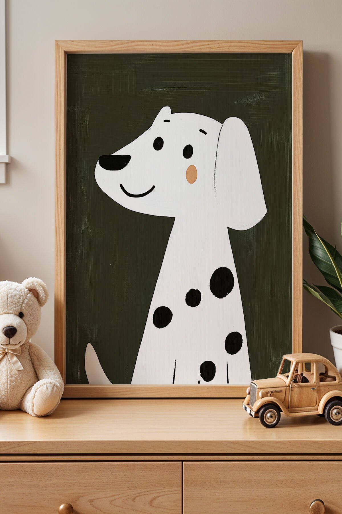 DOĞAL AHŞAP - Yeşil Fonlu Sevimli Köpek Çocuk Odası Ahşap Çerçeveli Duvar Tablosu