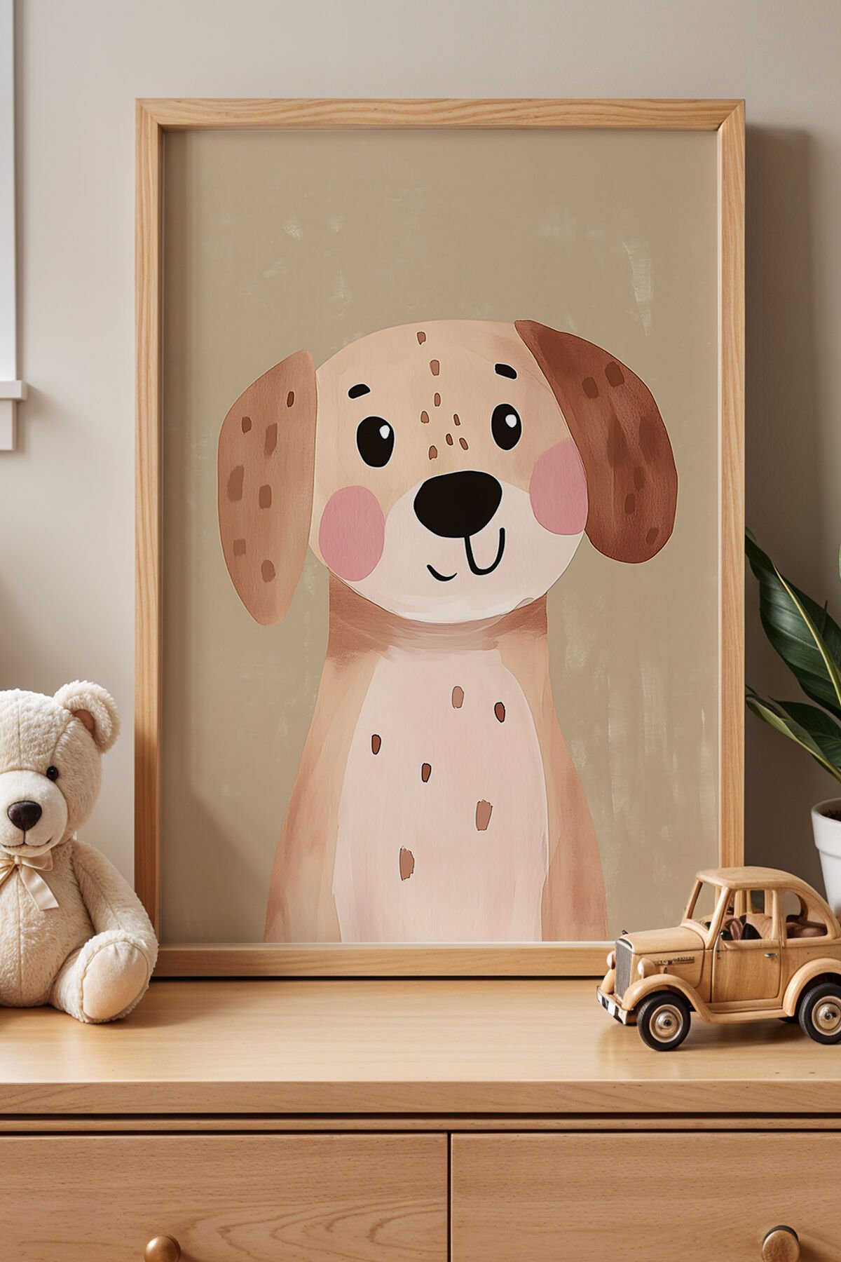 DOĞAL AHŞAP - Yeşil Fonlu Şirin Köpek Çocuk Odası Ahşap Çerçeveli Duvar Tablosu