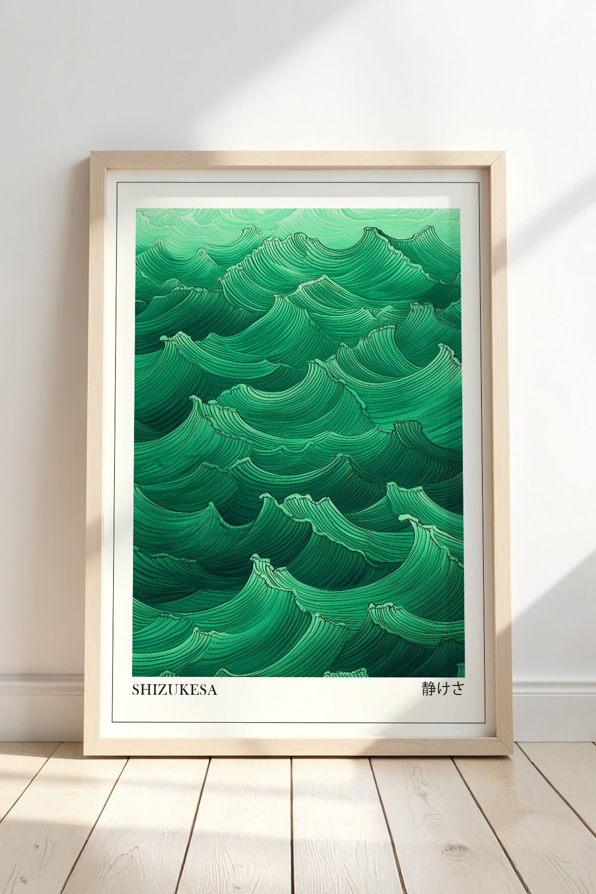 DOĞAL AHŞAP - Yeşil Tonlarda Soyut Dalga Desenli Japandi Ahşap Çerçeveli Duvar Tablosu