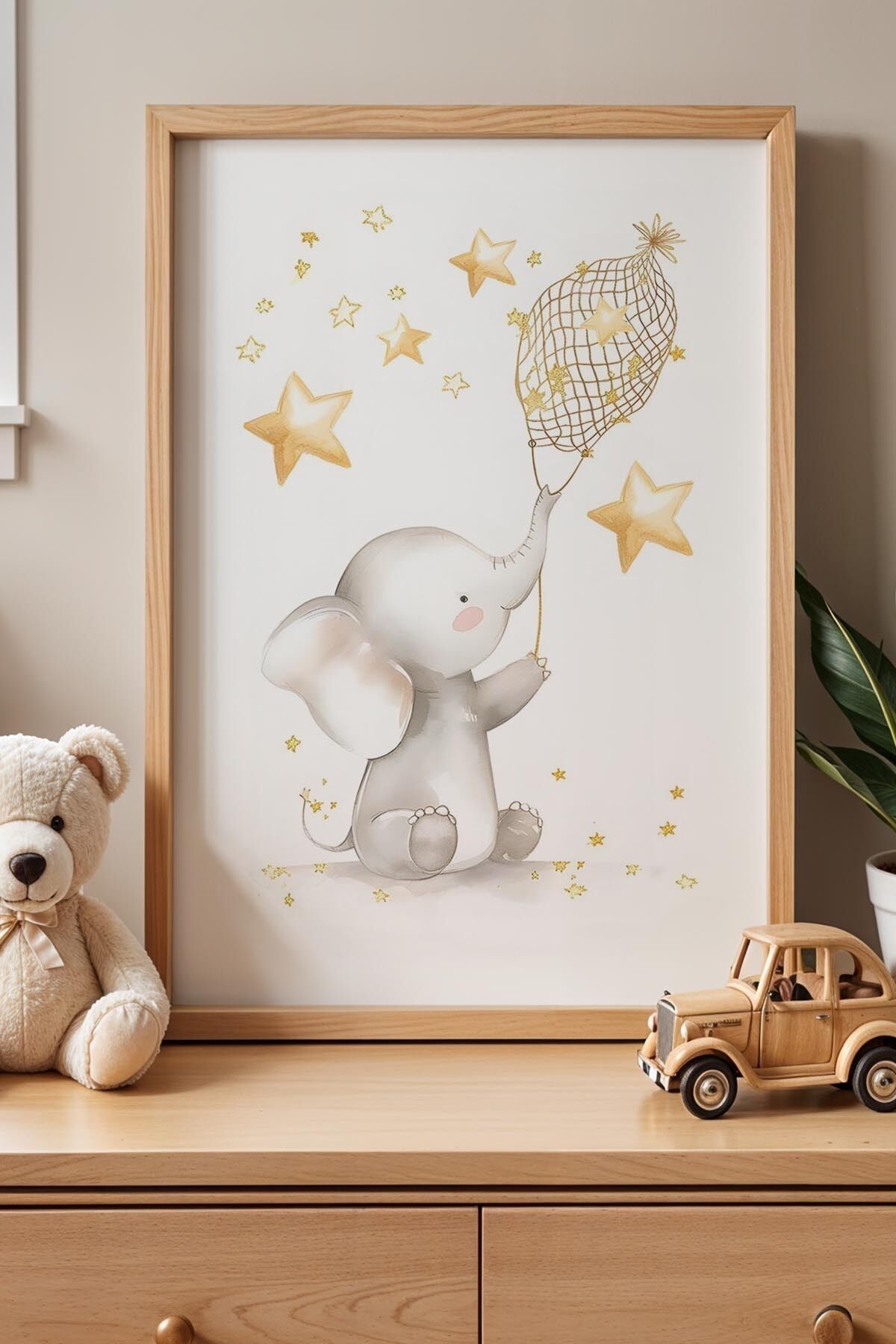DOĞAL AHŞAP - Yıldızların Altına Sevimli Fil Çocuk Odası Ahşap Çerçeveli Duvar Tablosu
