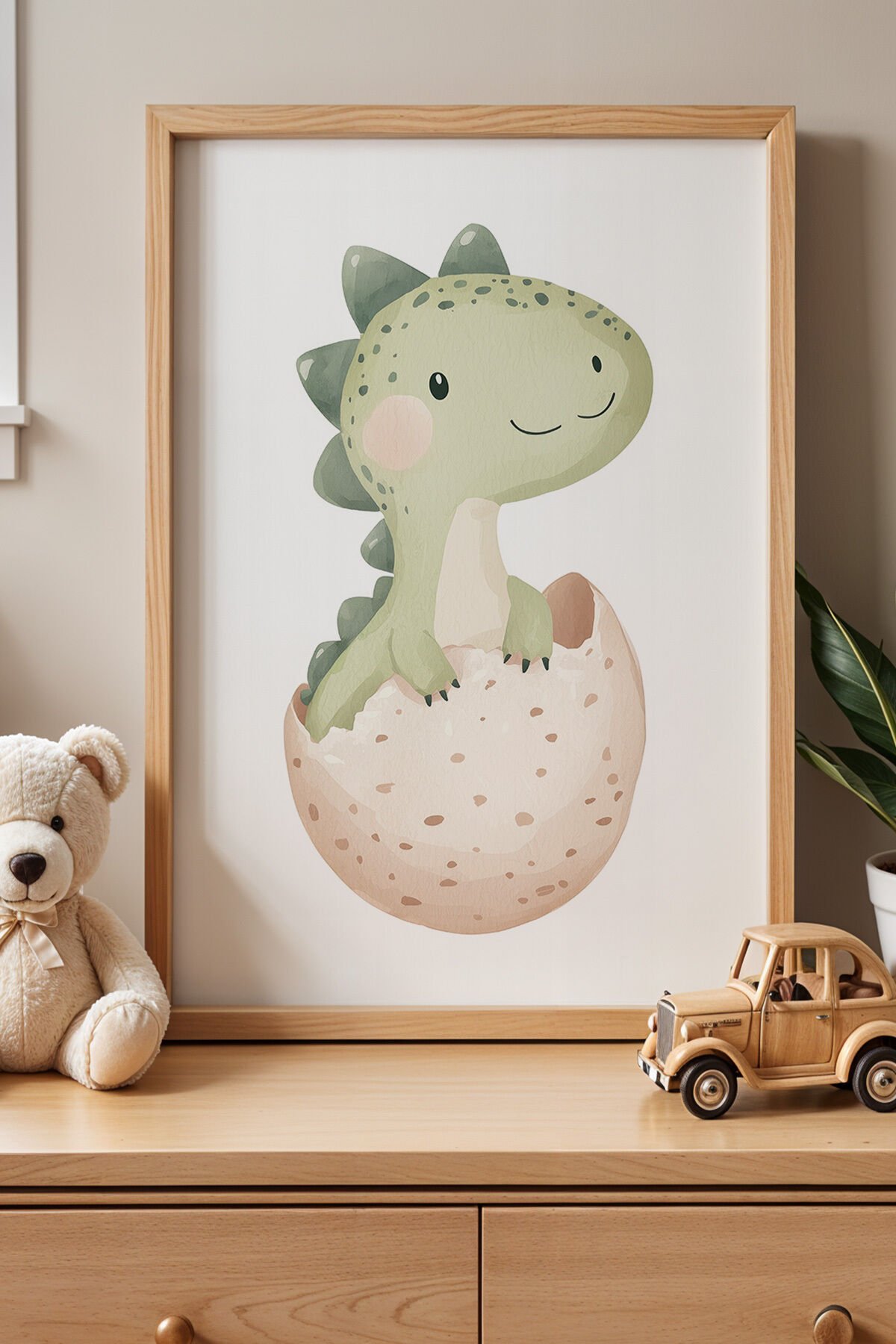 DOĞAL AHŞAP - Yumurtadan Yeni Çıkmış Sevimli Dinozor - Doğal Ahşap Çerçeveli Çocuk Odası ve Bebek Odası Tablosu