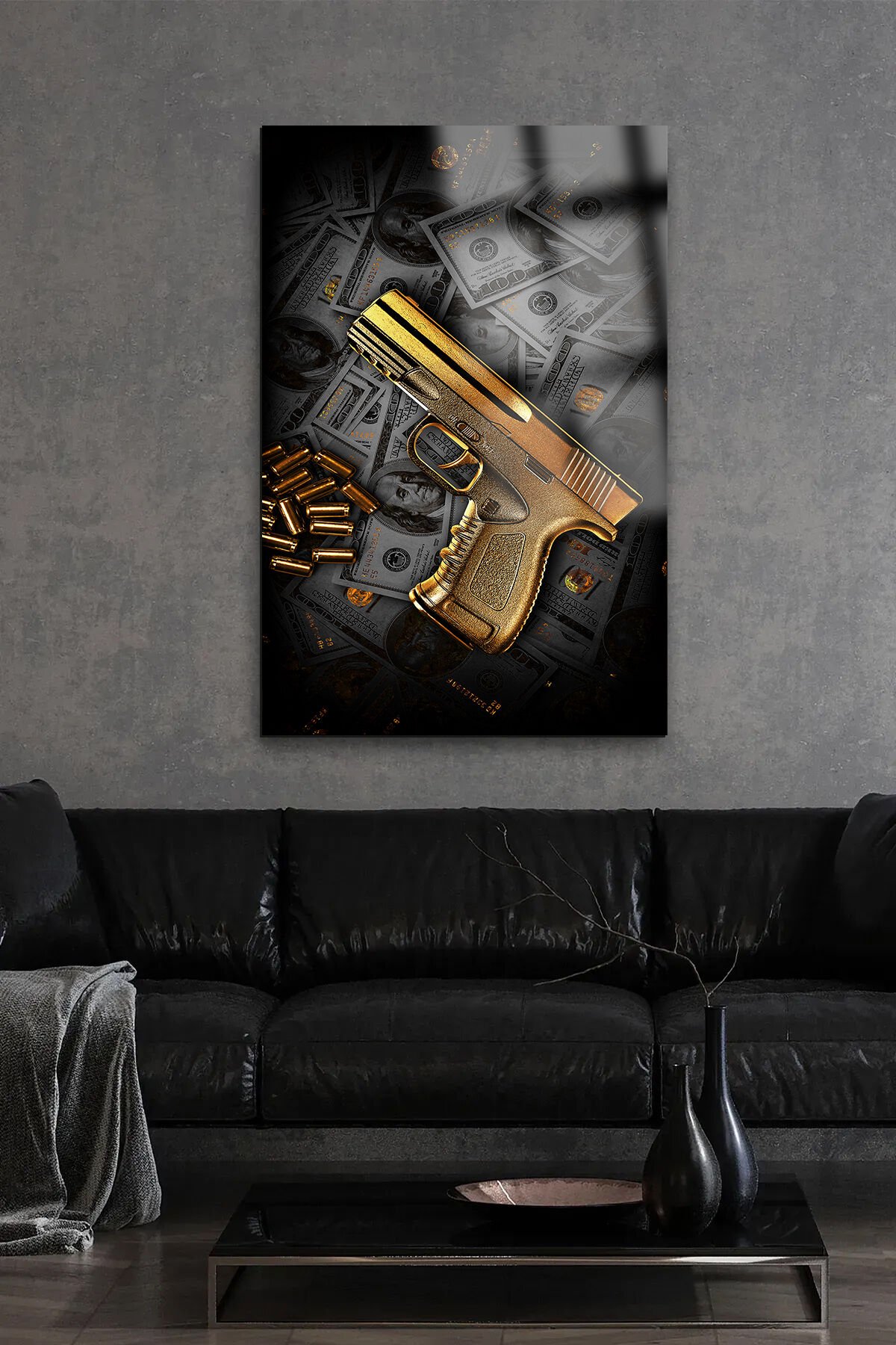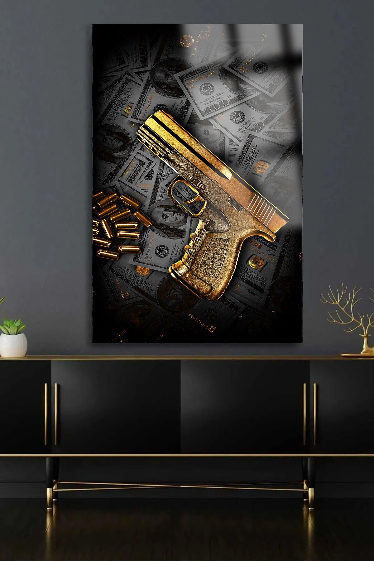 DOLAR VE ALTIN SİLAH TASARIMI MAFİA TABLOSU EV HEDİYESİ KIRILMAZ LÜKS MODERN CAM TABLO