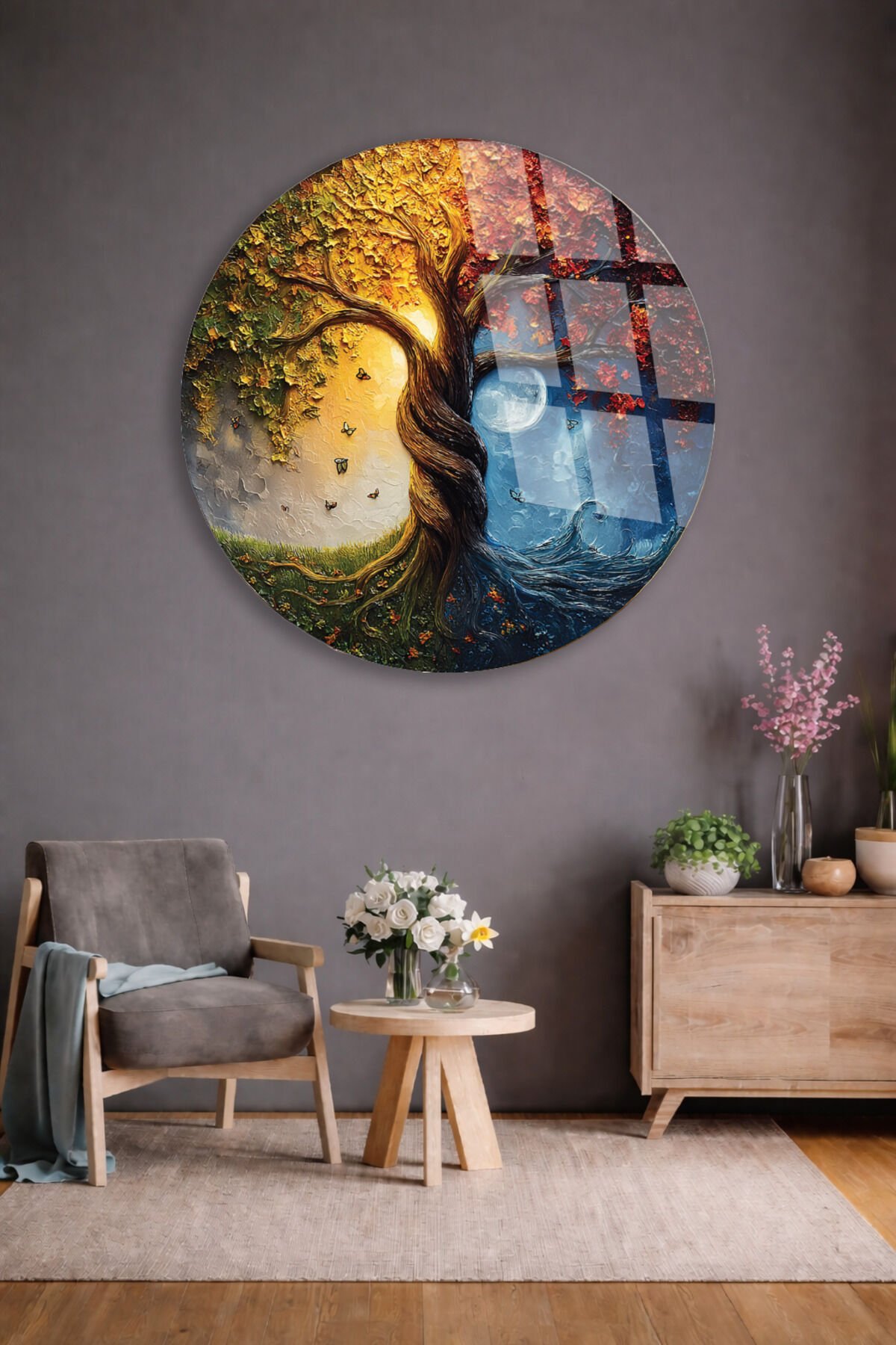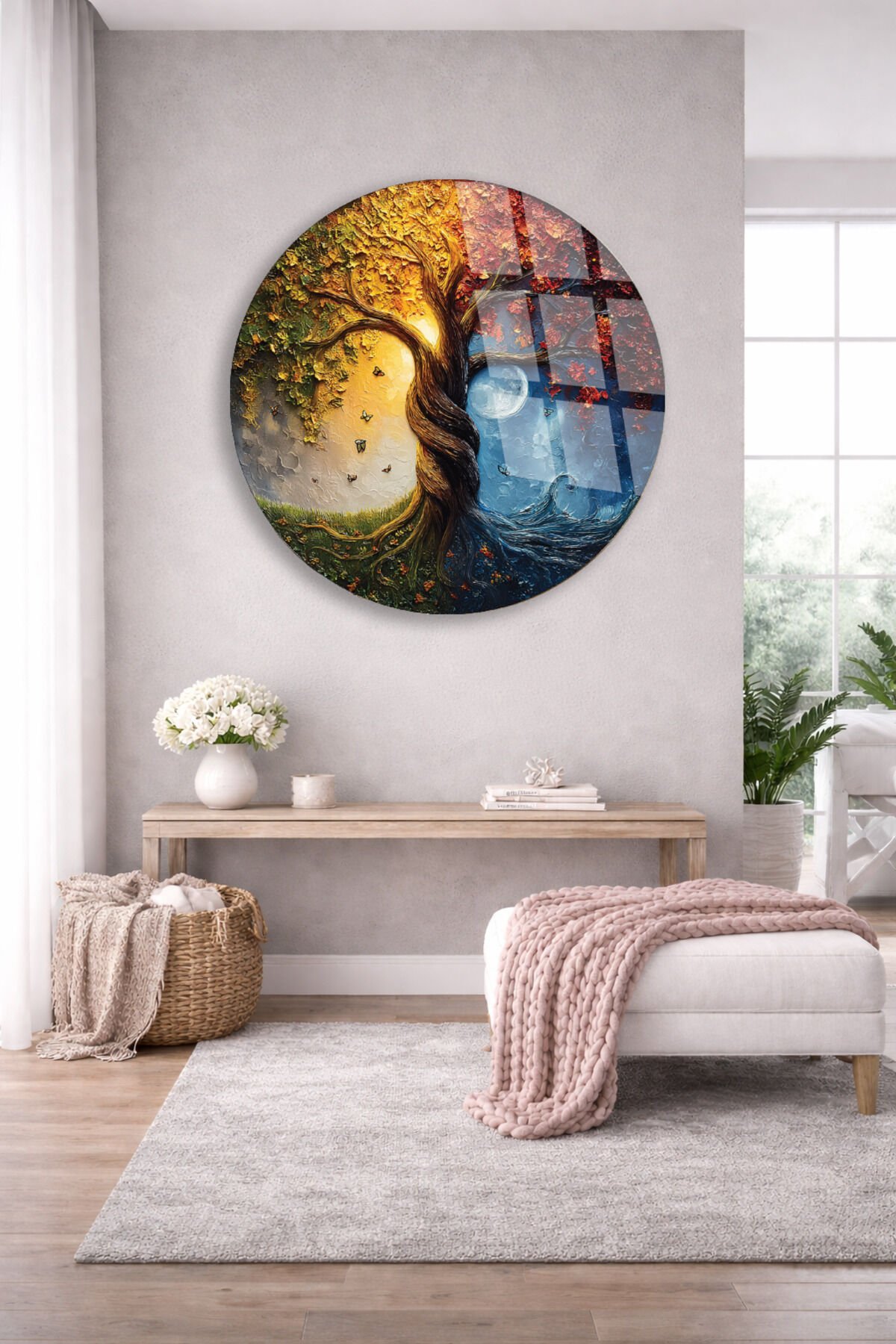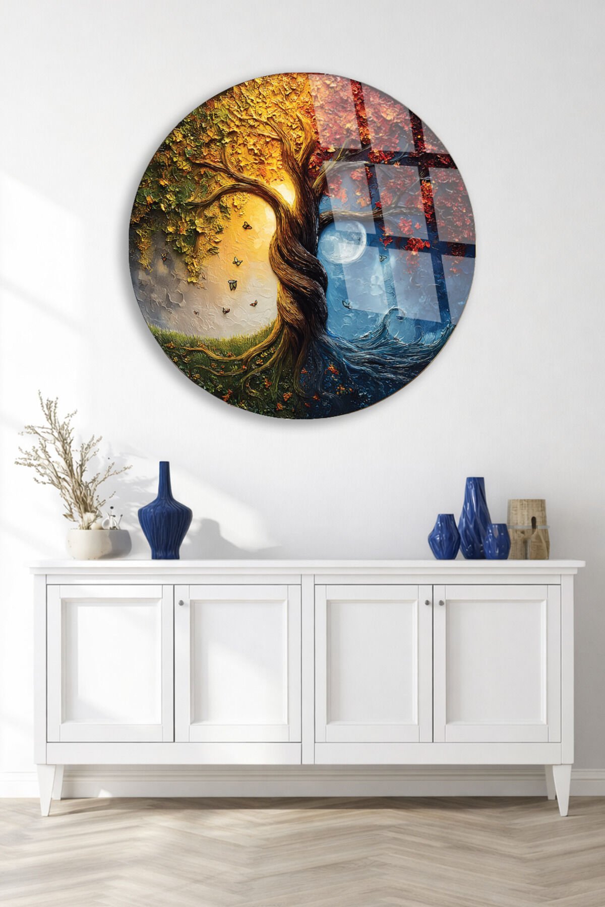 DÖRT MEVSİM TEMALI FANTASTİK HAYAT AĞACI SANATSAL KIRILMAZ CAM TABLO Altın