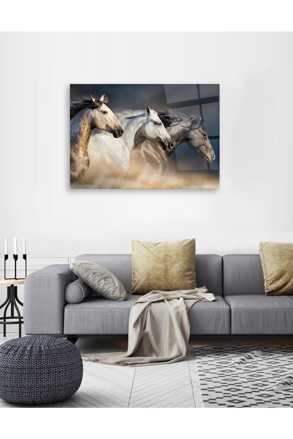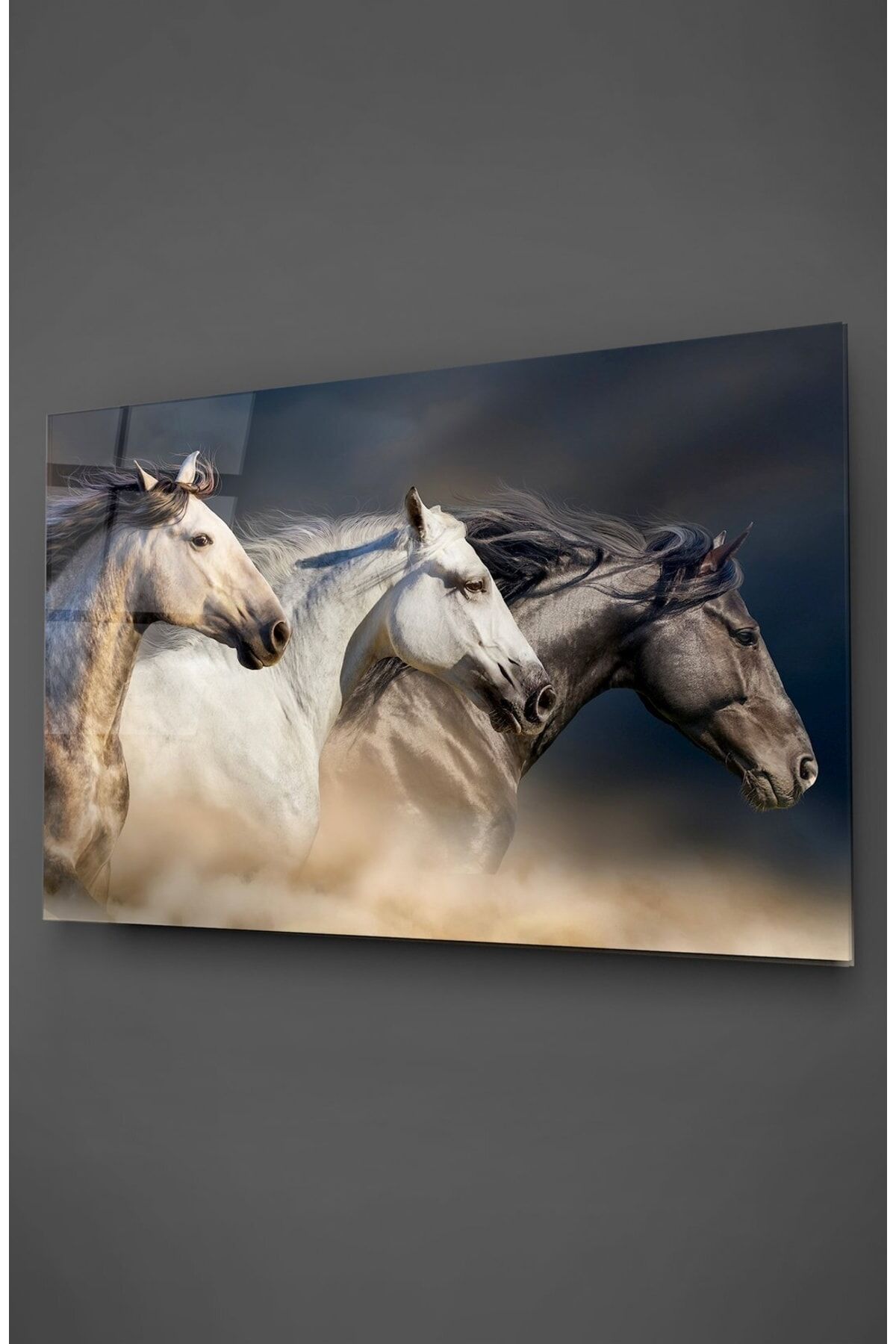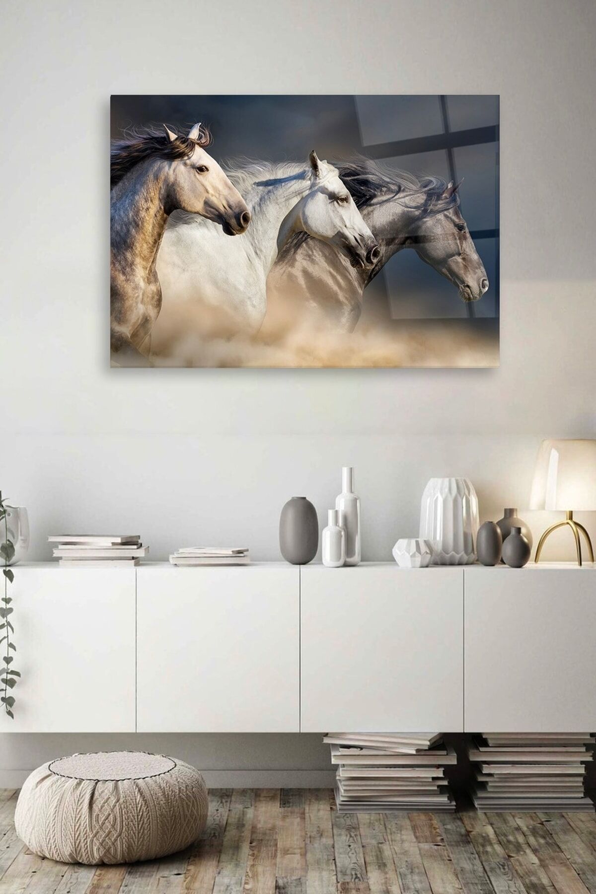 Dört Nala Koşan Atlar Cam Tablo Renkli