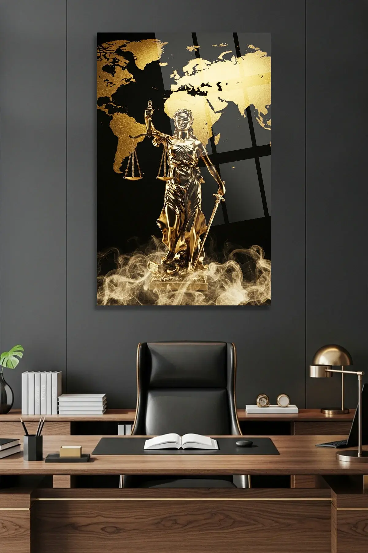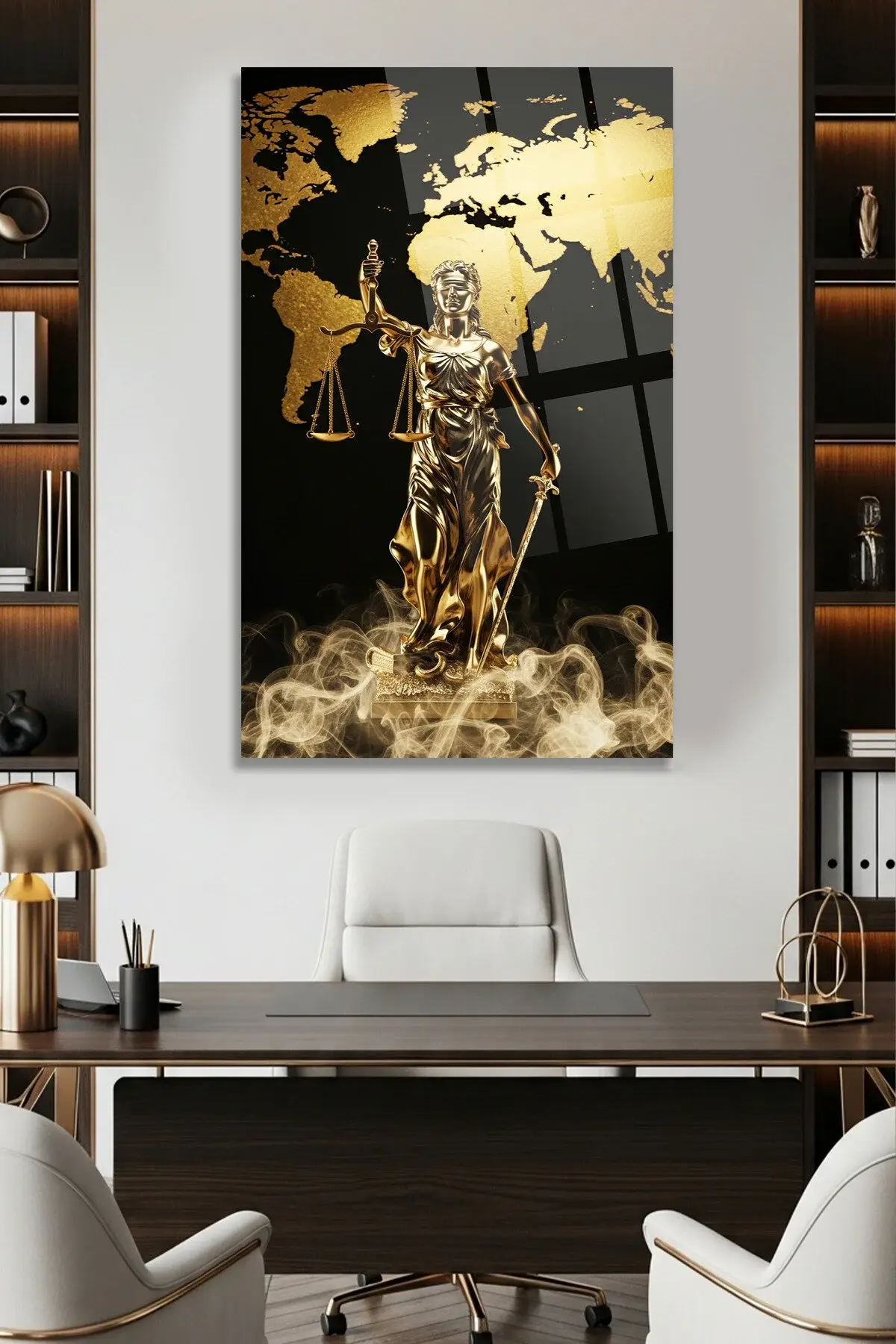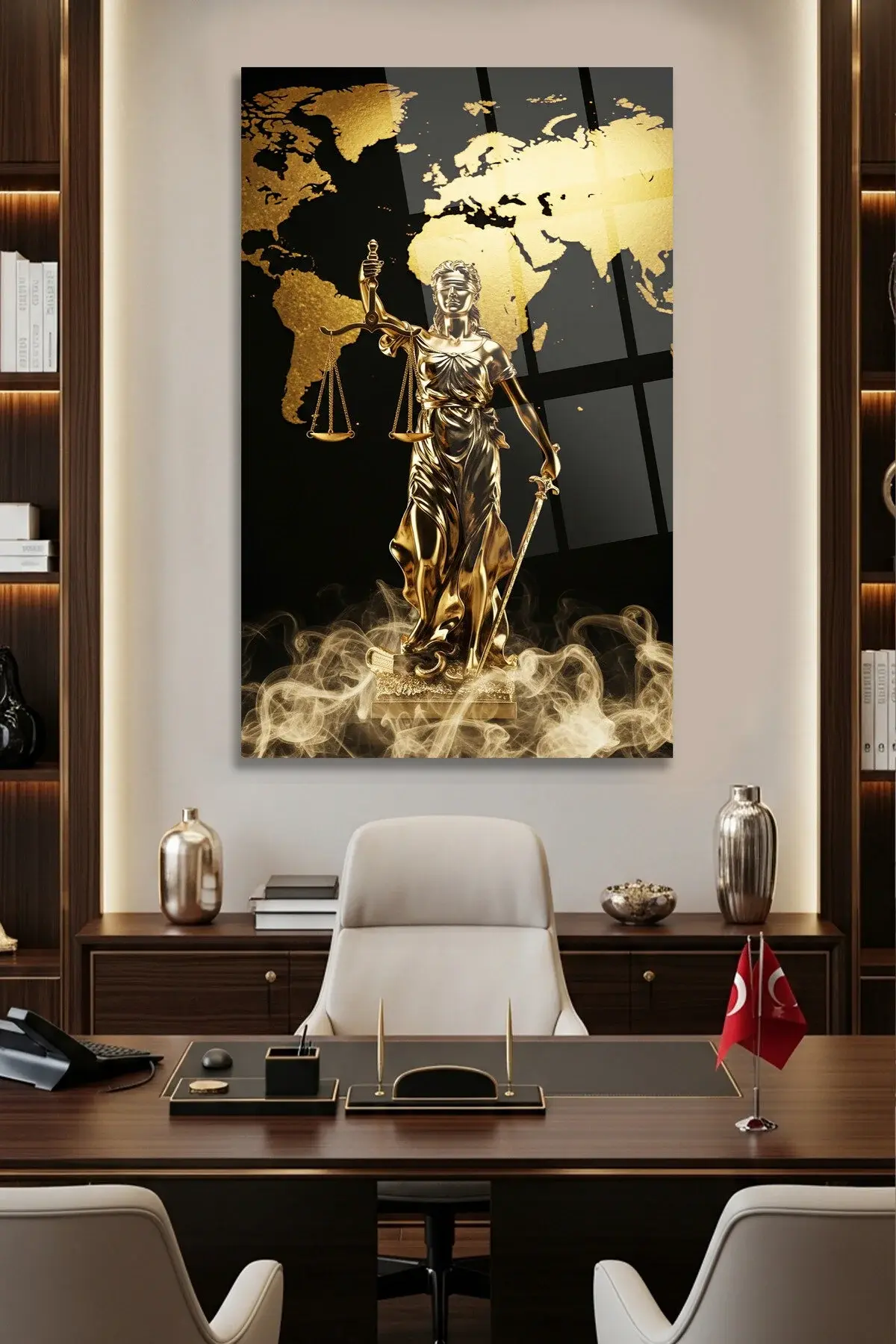 DÜNYA HARİTALI THEMİS HEYKELİ TASARIMI CAM TABLO MODERN KIRILMAZ CAM TABLO HUKUK BÜROSU TABLOSU
