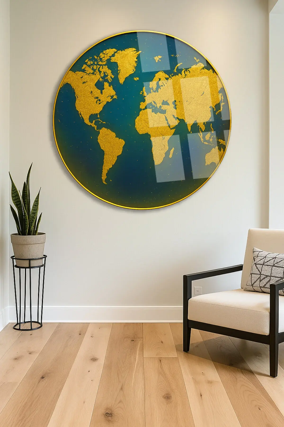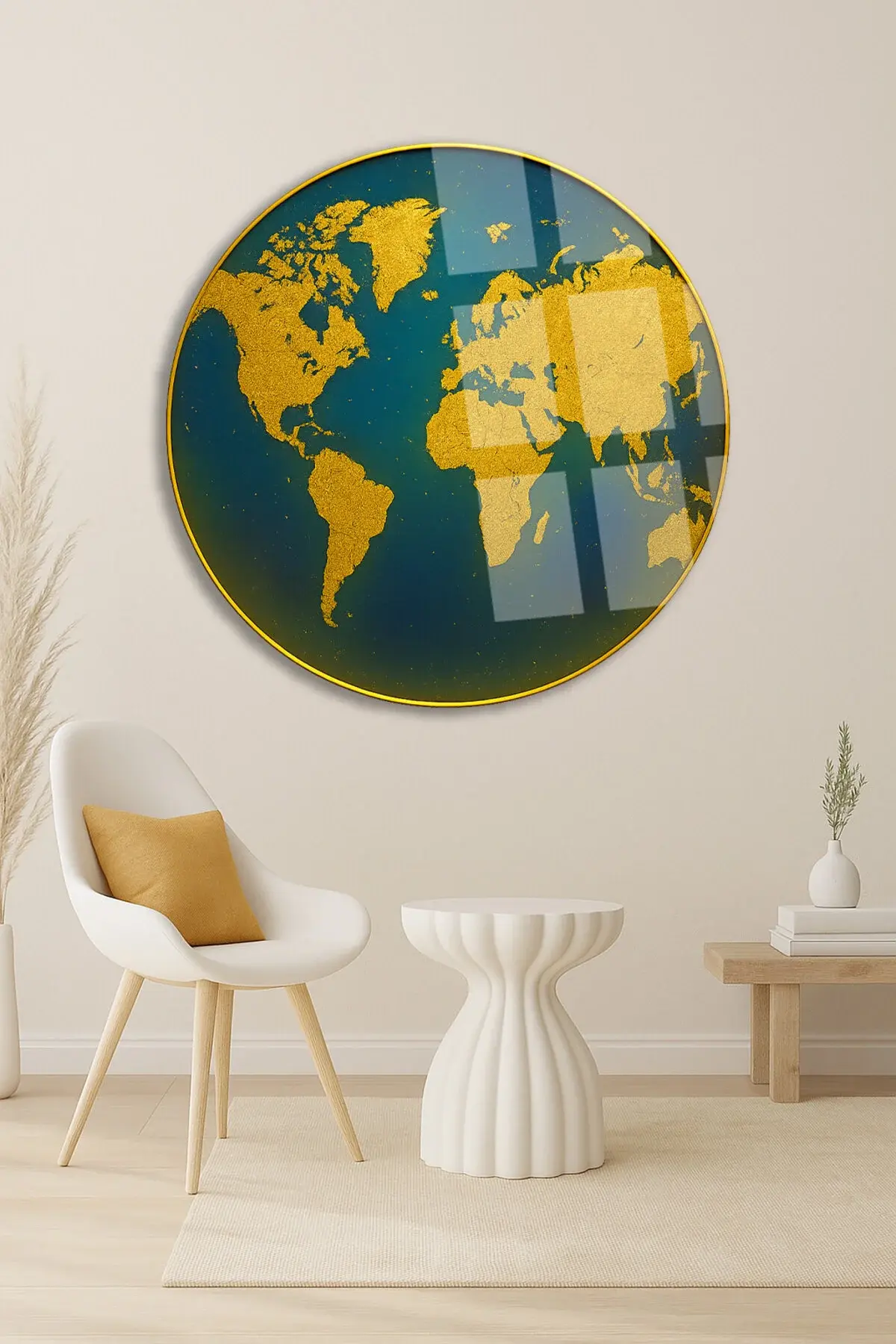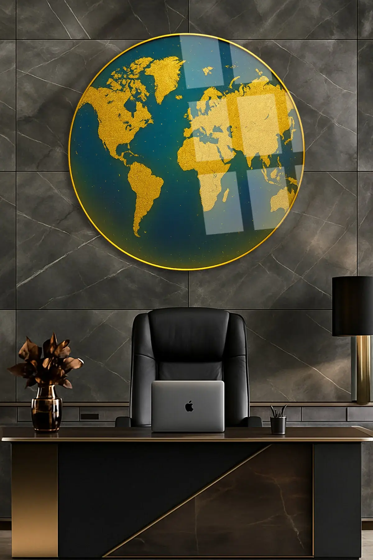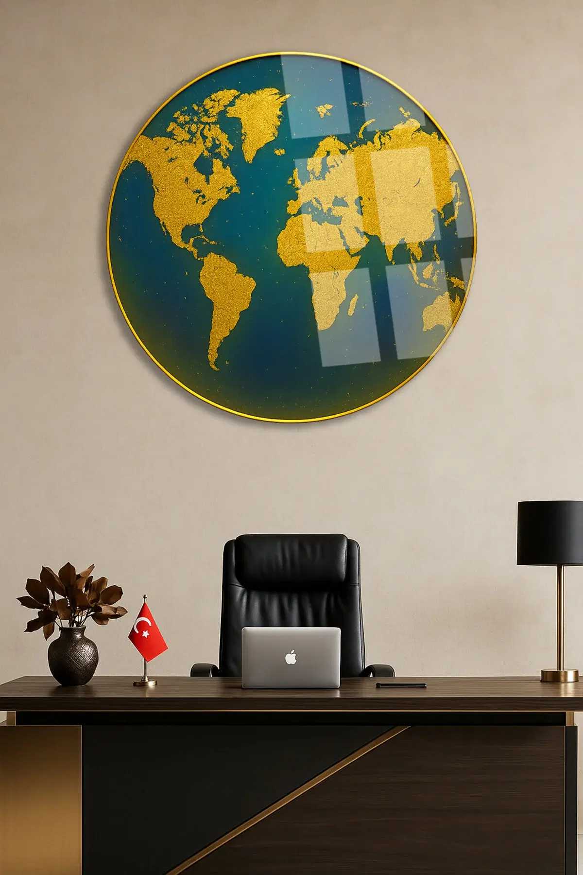DÜNYA HARİTASI IŞILTILI TABLOSU YUVARLAK ŞIK VE LÜKS KIRILMAZ MODERN CAM TABLO OFİS HEDİYESİ TABLO Turkuaz