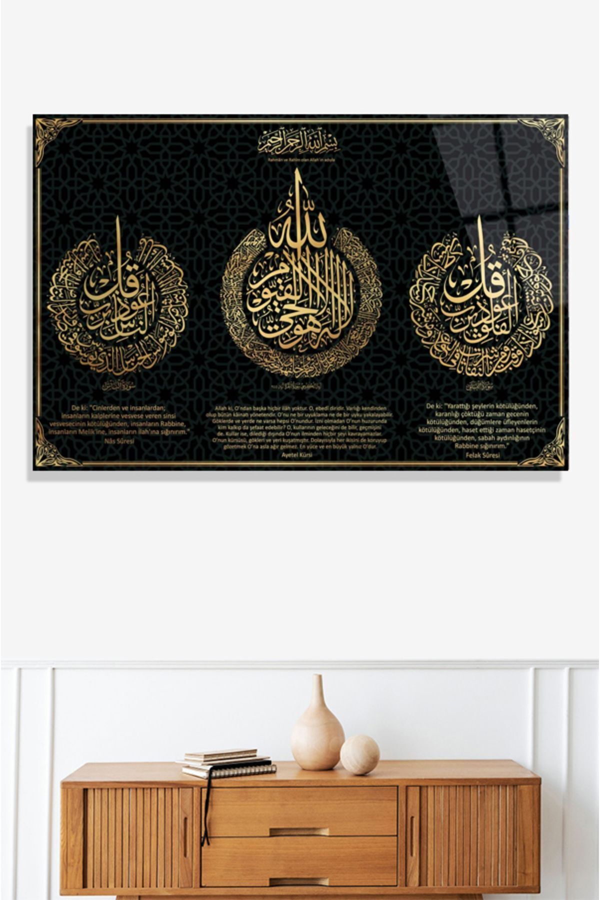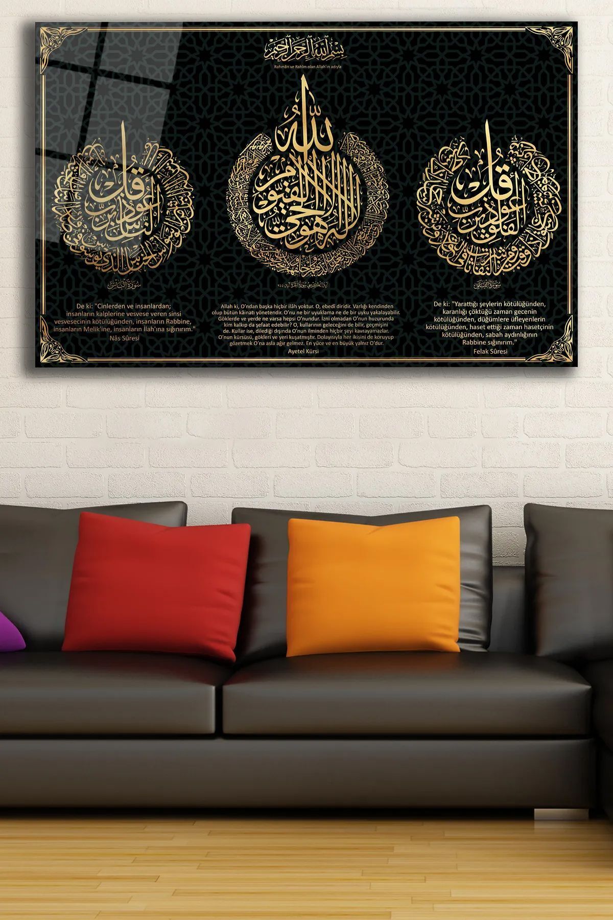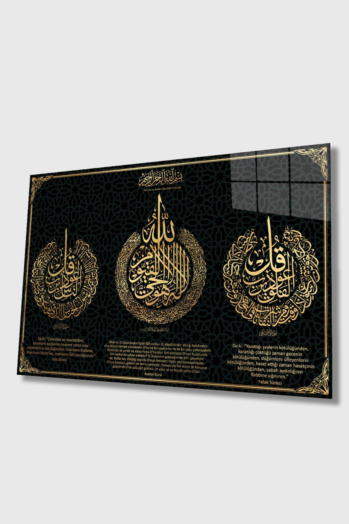 Felak Suresi, Nas Suresi ve Ayetel Kürsi-islami Tablo- 4mm Kırılmaz Yüksek Çözünürlüklü Cam Tablo siyah 3