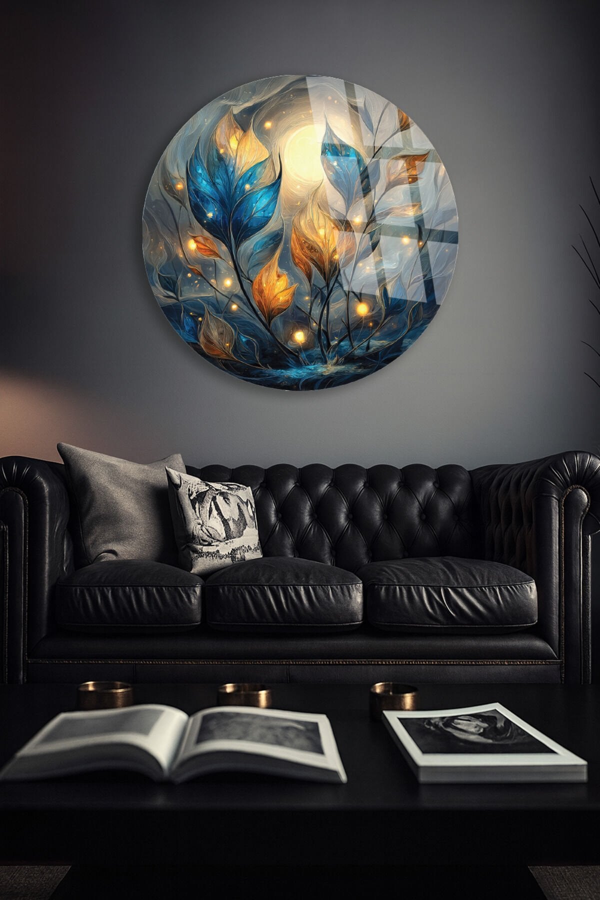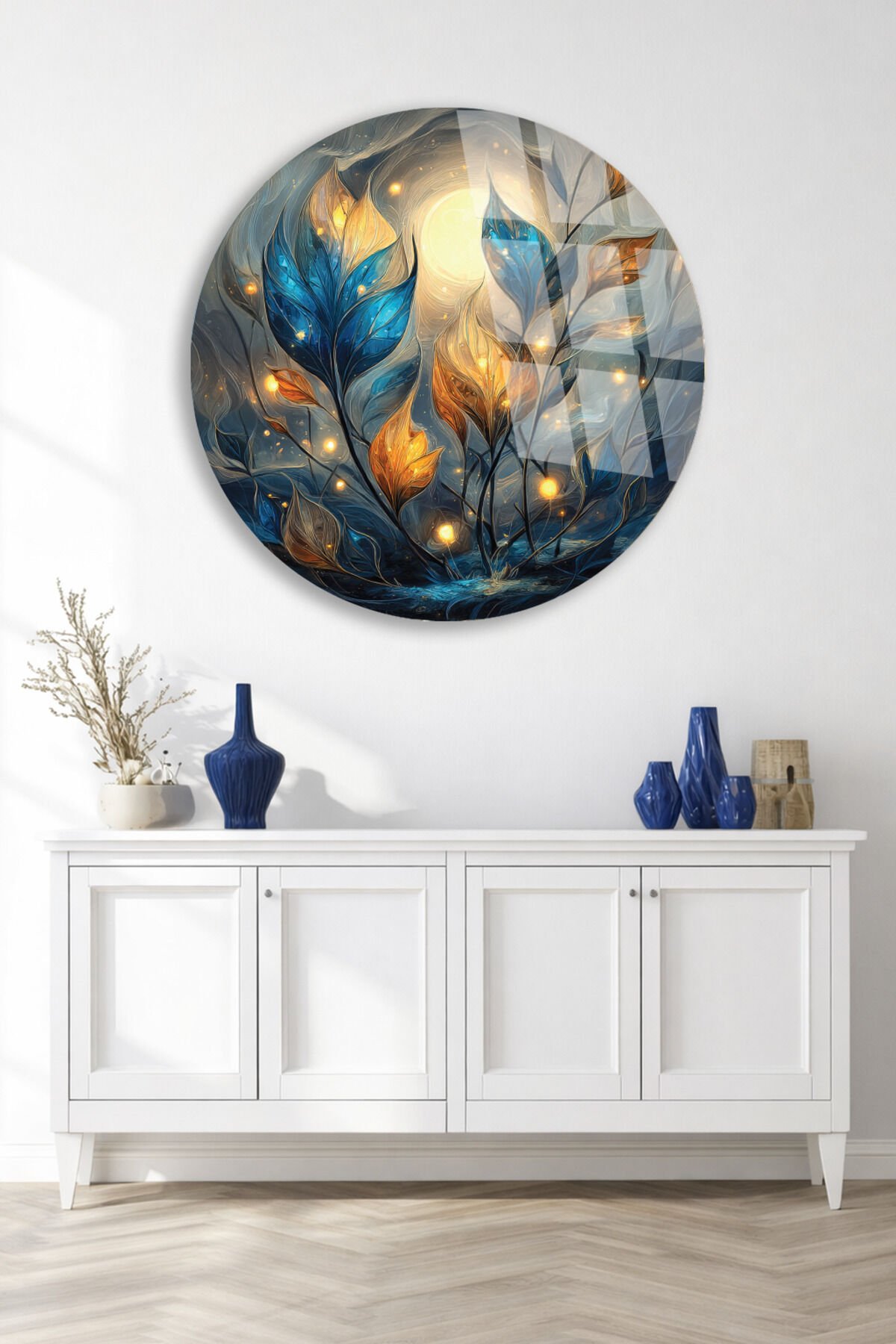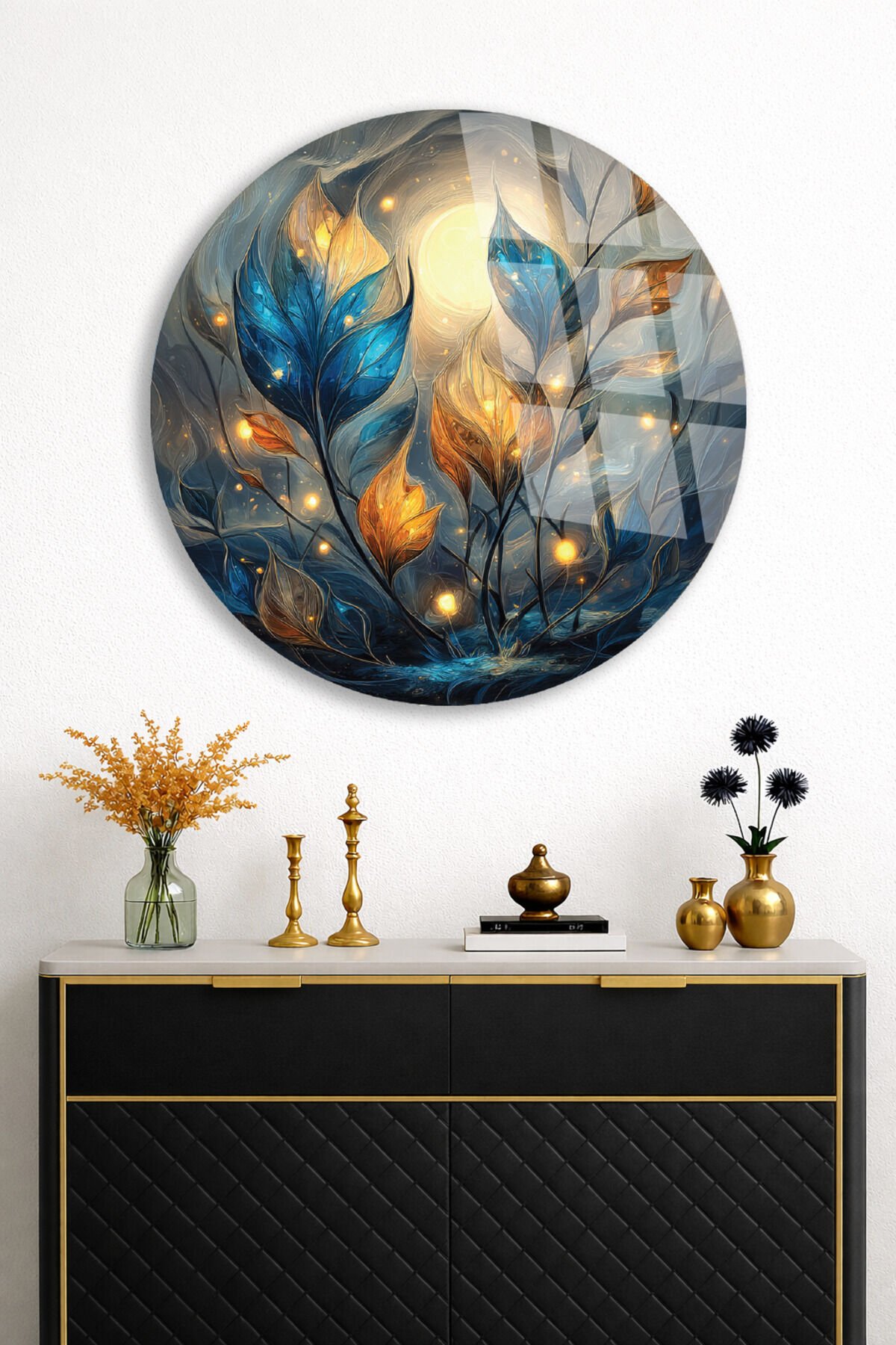 Gece Bahçesi Cam Tablo – Işıklı Yapraklar ve Ay Teması Turkuaz
