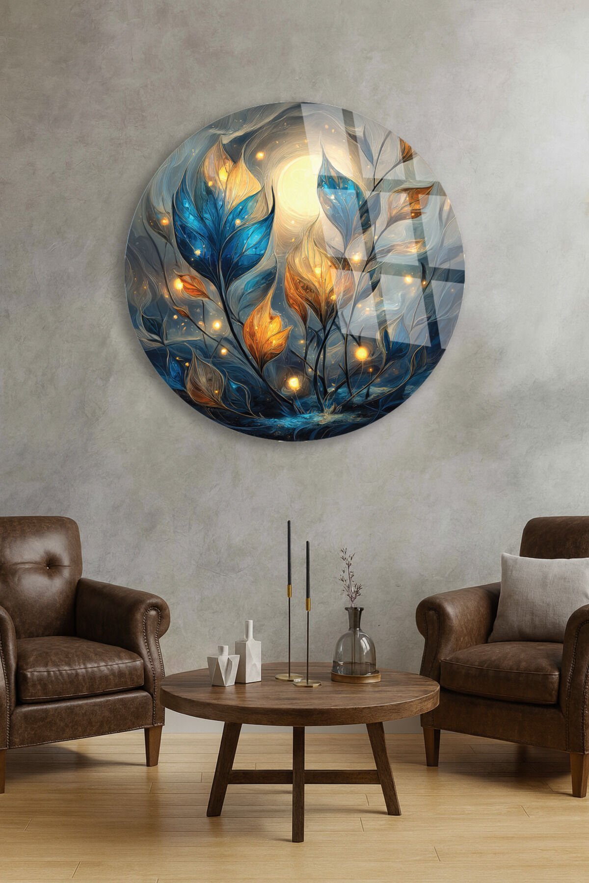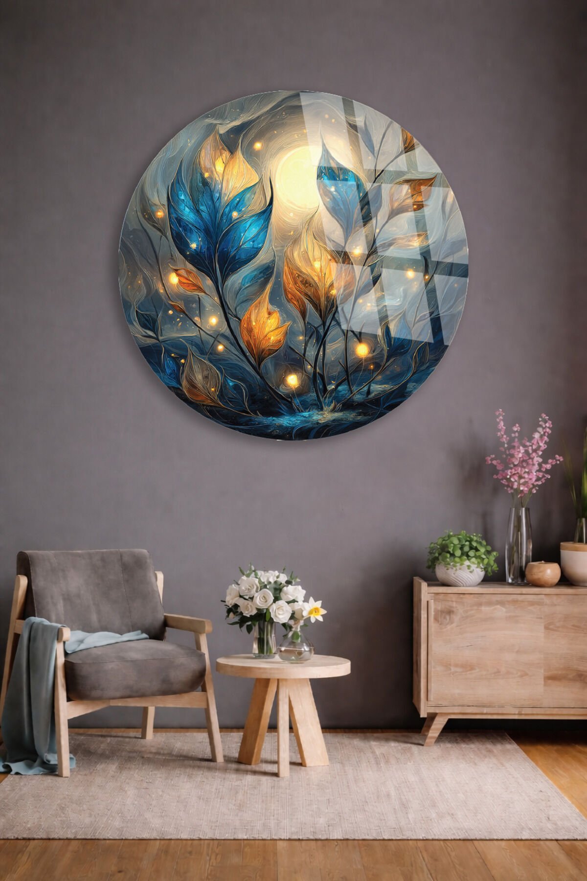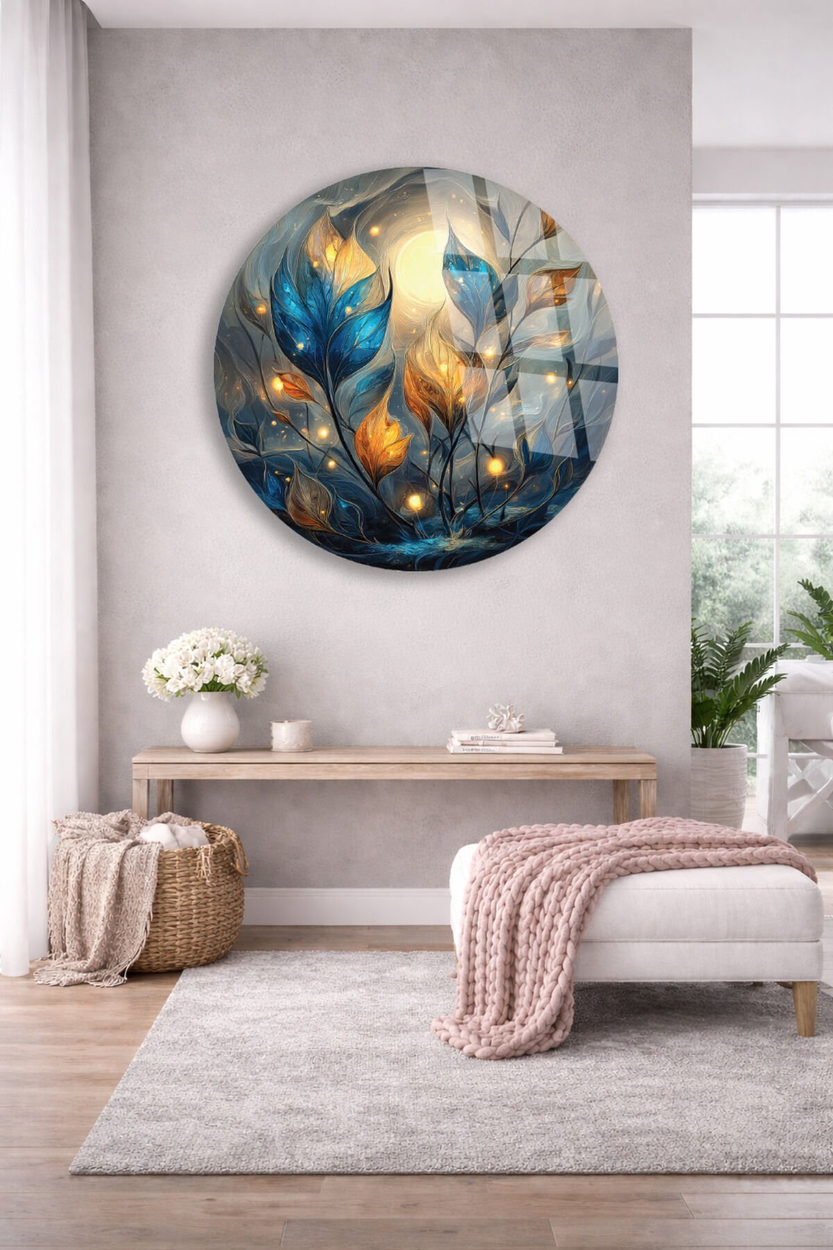 Gece Bahçesi Cam Tablo – Işıklı Yapraklar ve Ay Teması Turkuaz