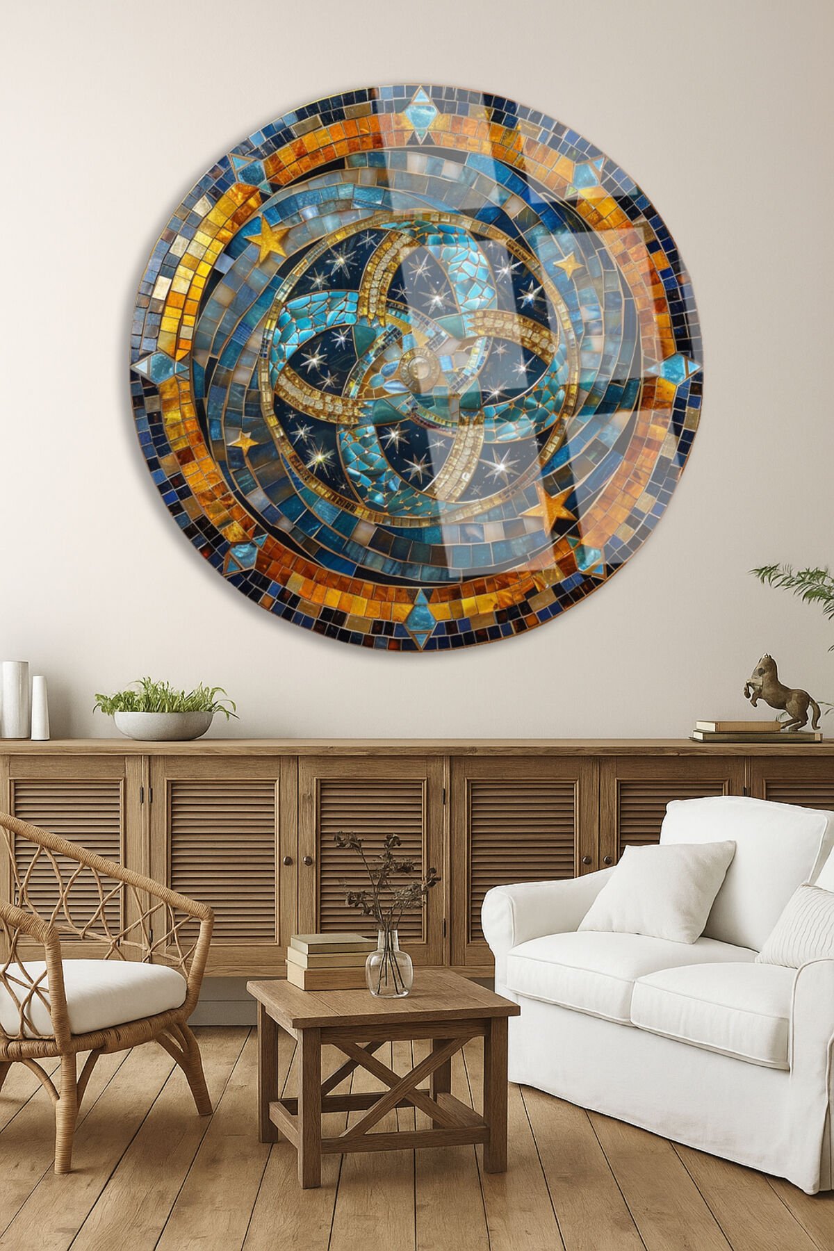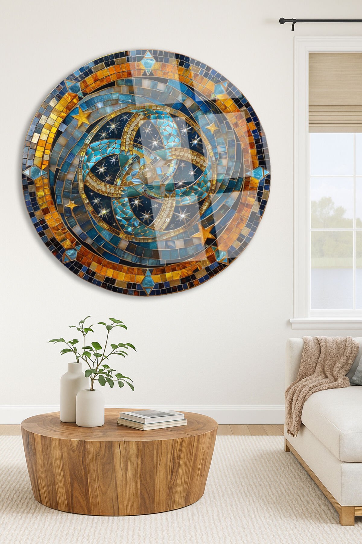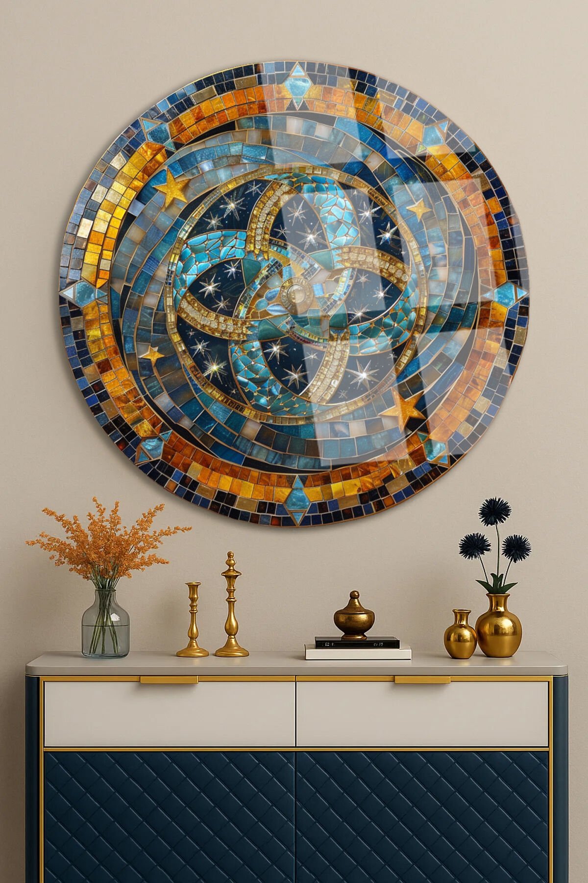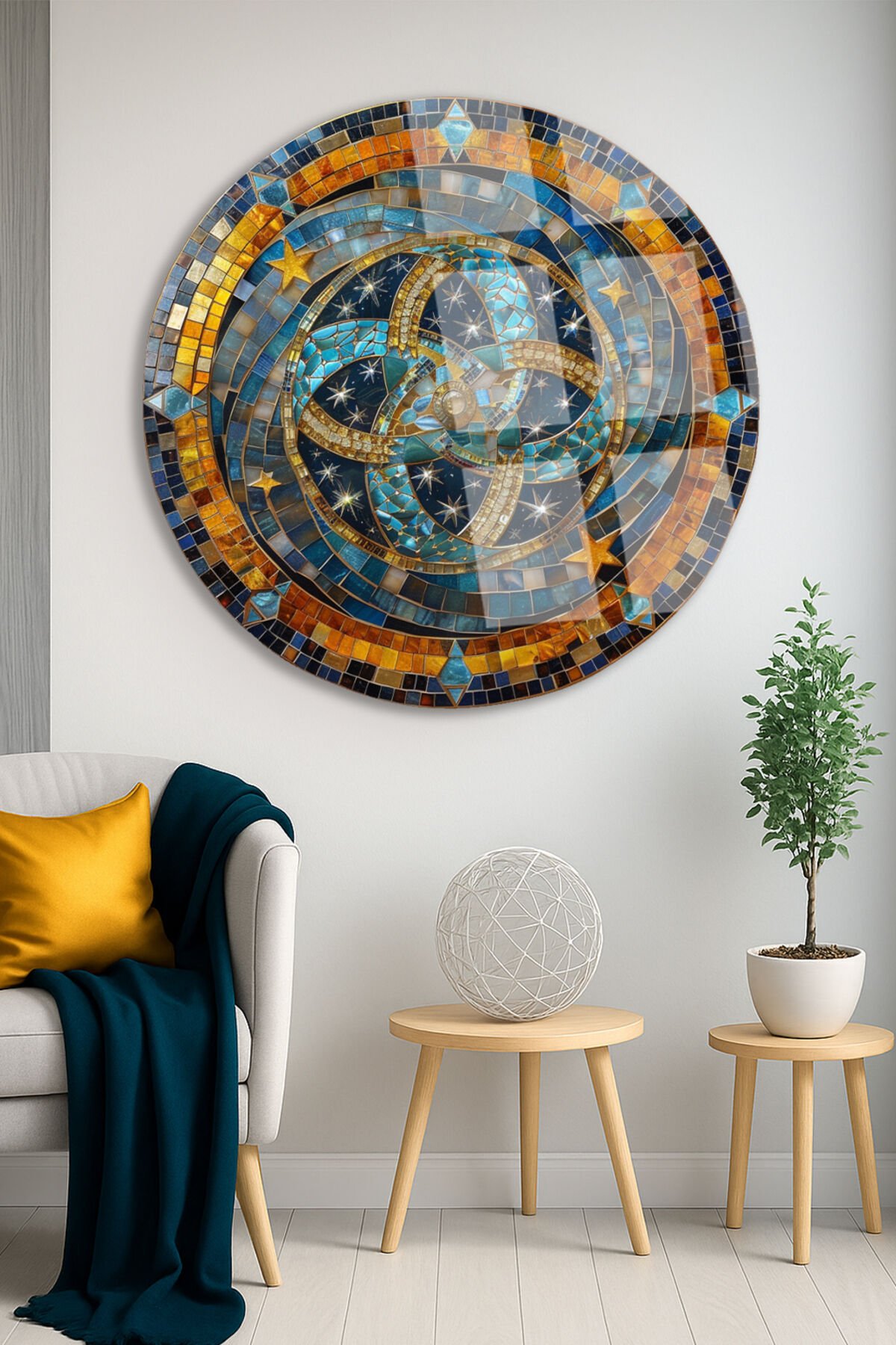 Gece Gökyüzü Esintili Mozaik Taş Yuvarlak Kırılmaz Cam Tablo Modern Tablo Ev Hediyesi Tablo Turuncu