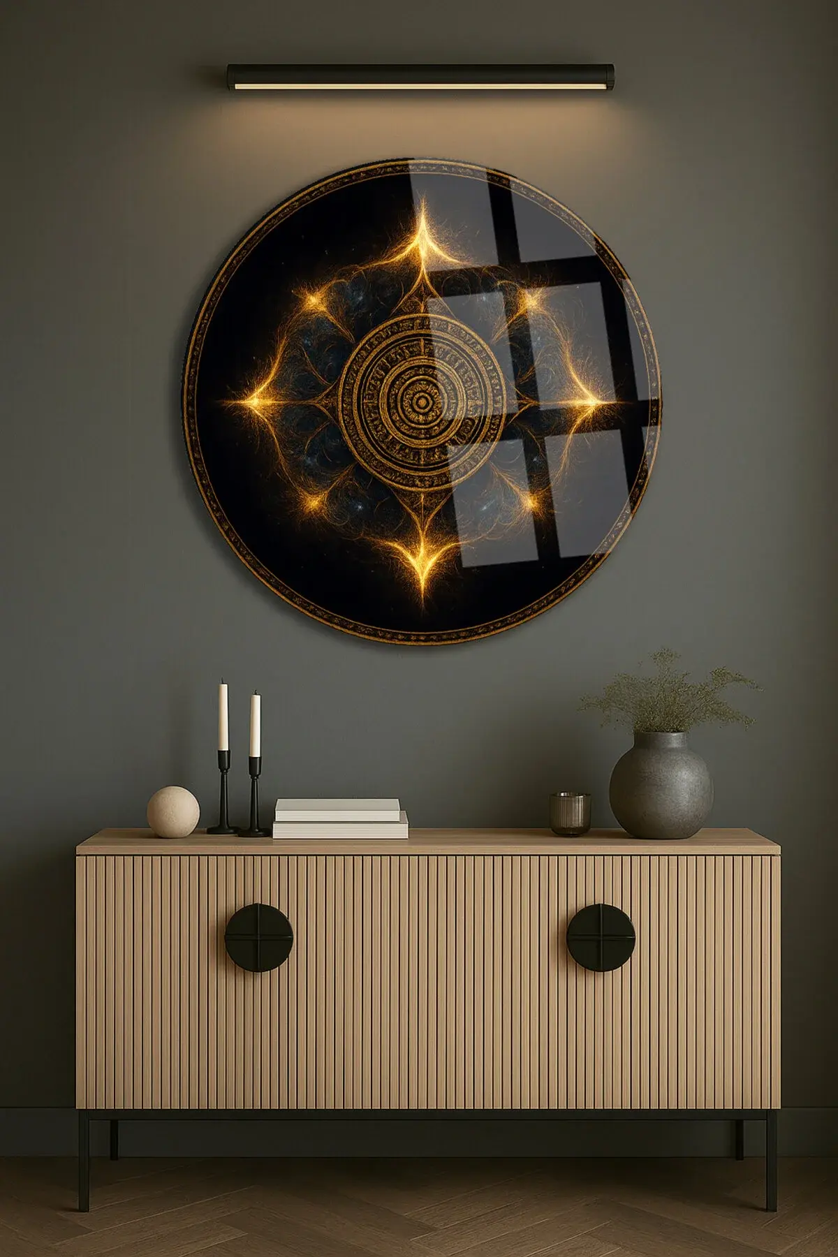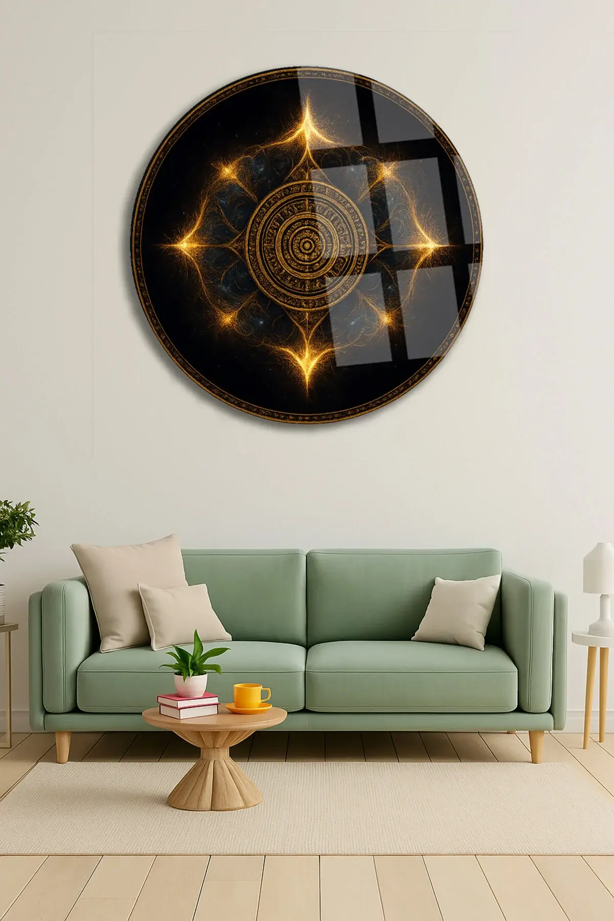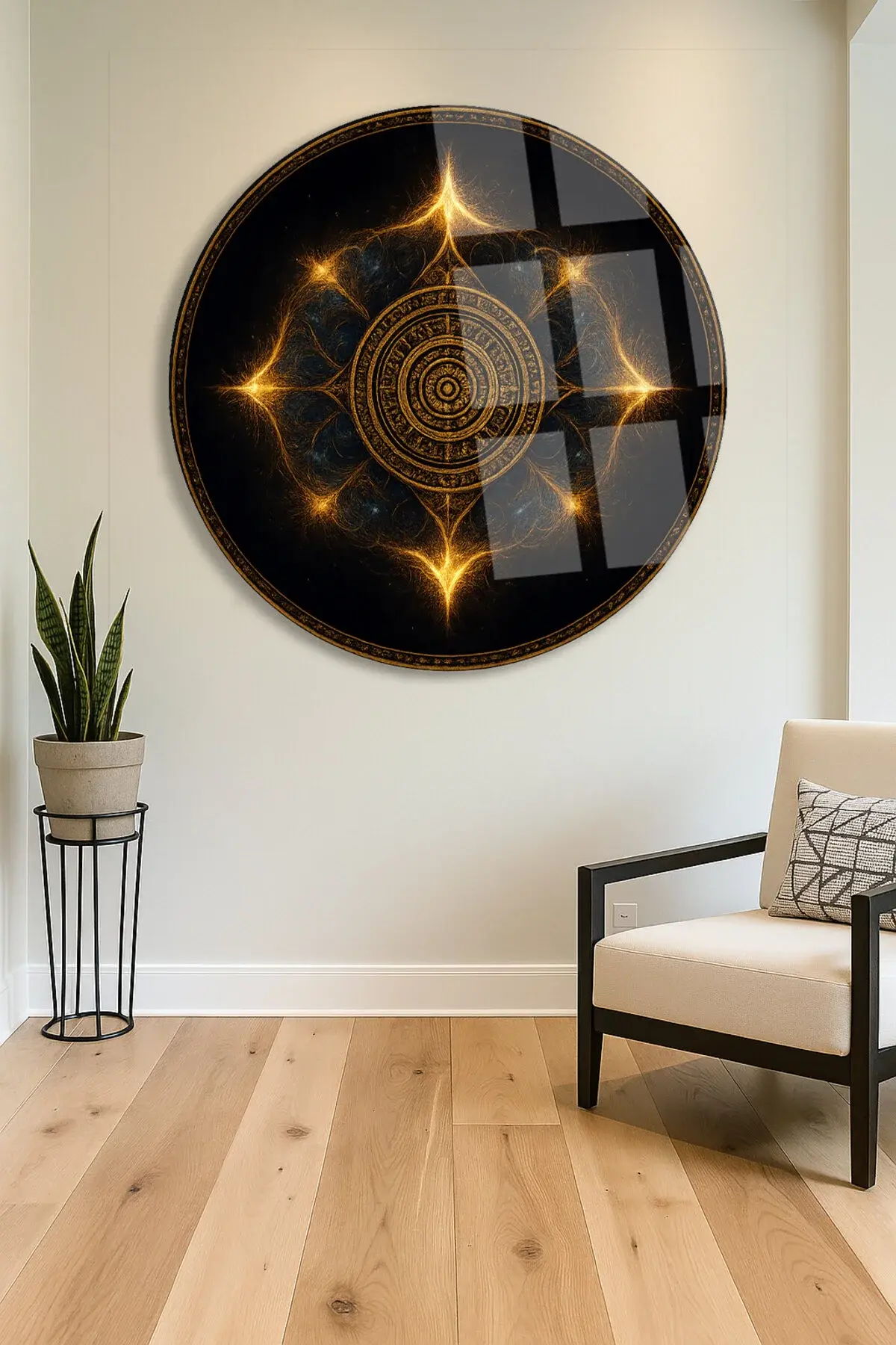 GEOMETRİK MANDALA TASARIMI MODERN KIRILMAZ LÜKS YUVARLAK CAM TABLO MODERN HEDİYE TABLO Siyah