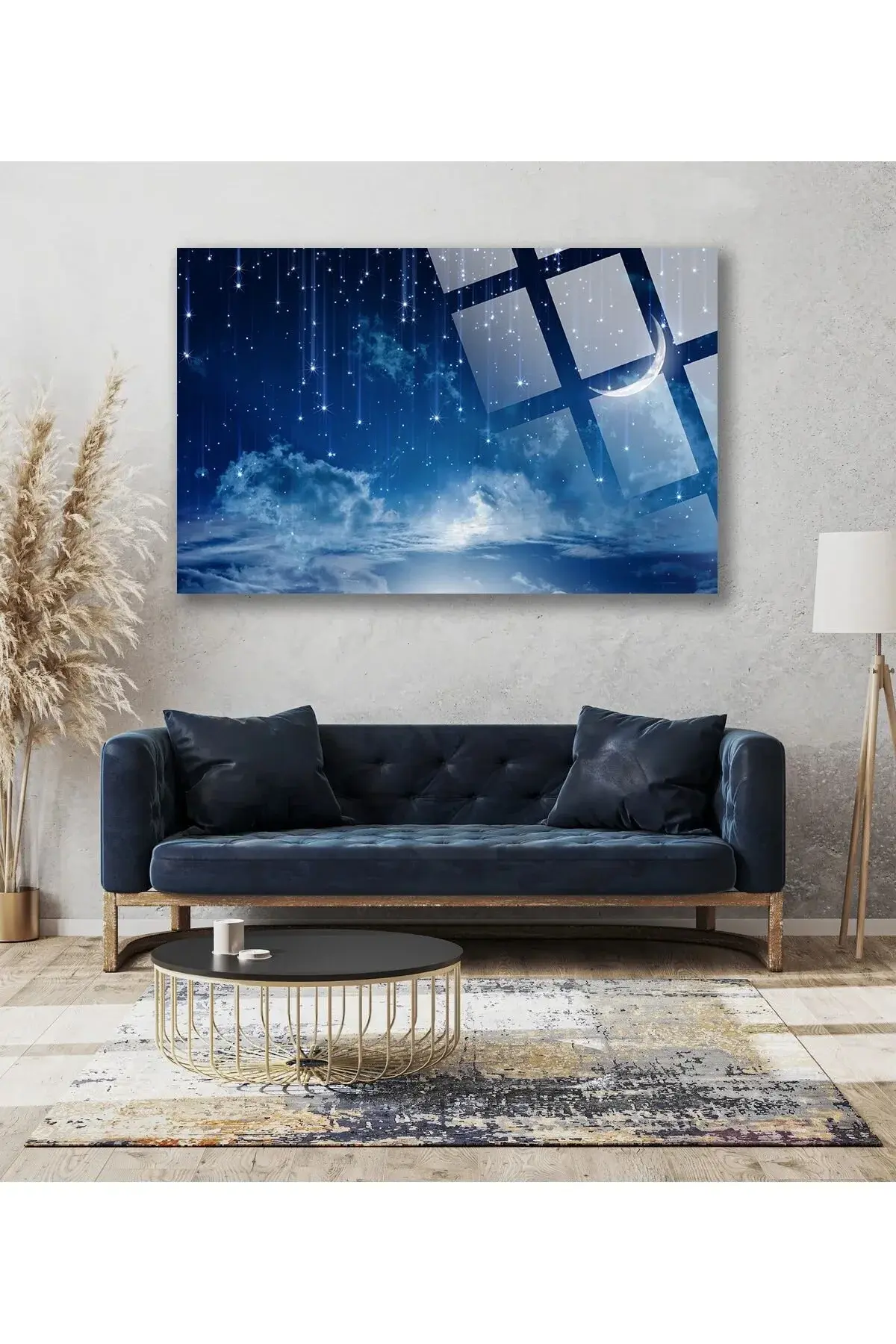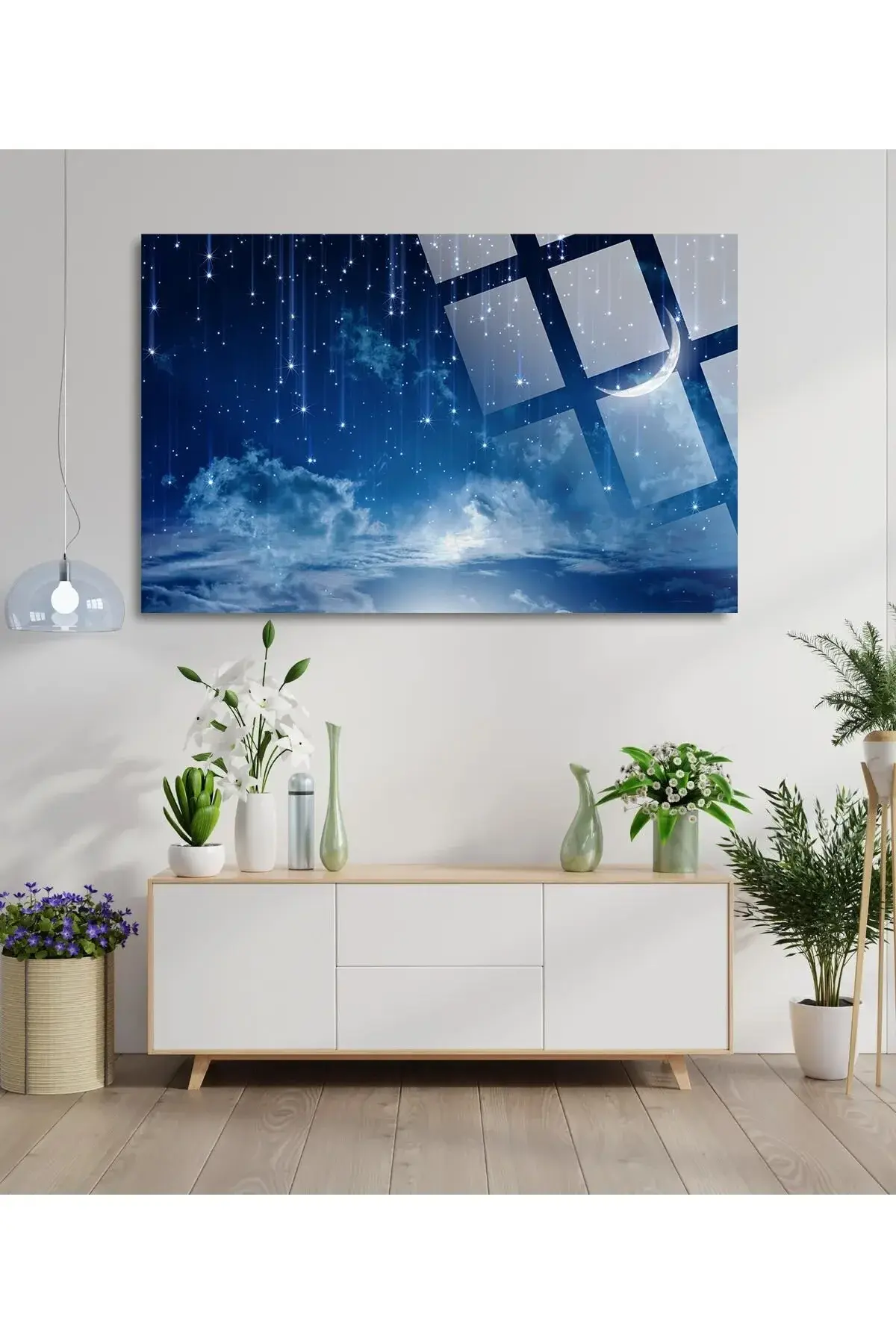 Gökyüzünü Aydınlatan Yarım Ay 4mm Lüks Kırılmaz Temperli Yüksek Çözünürlüklü Cam Tablo