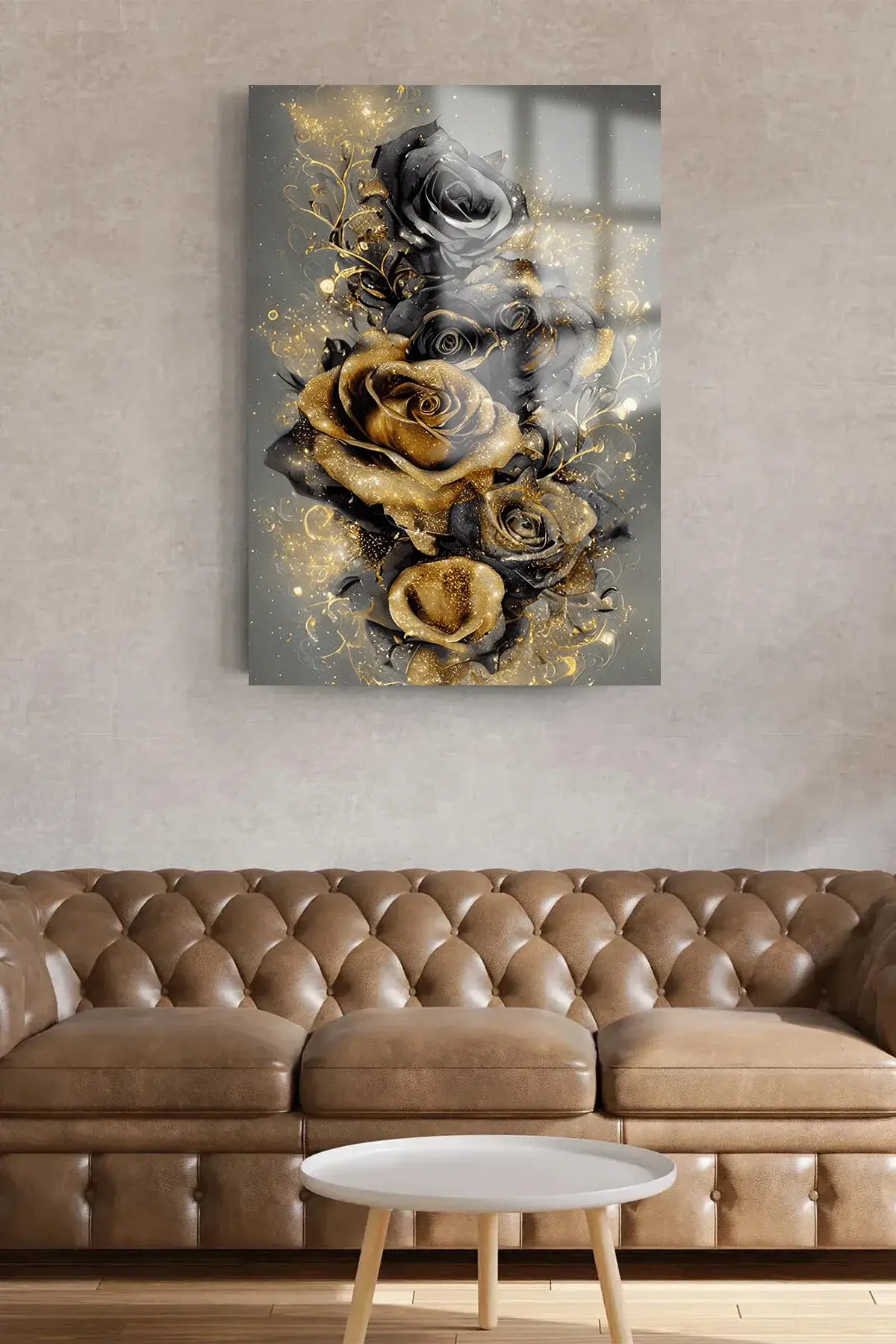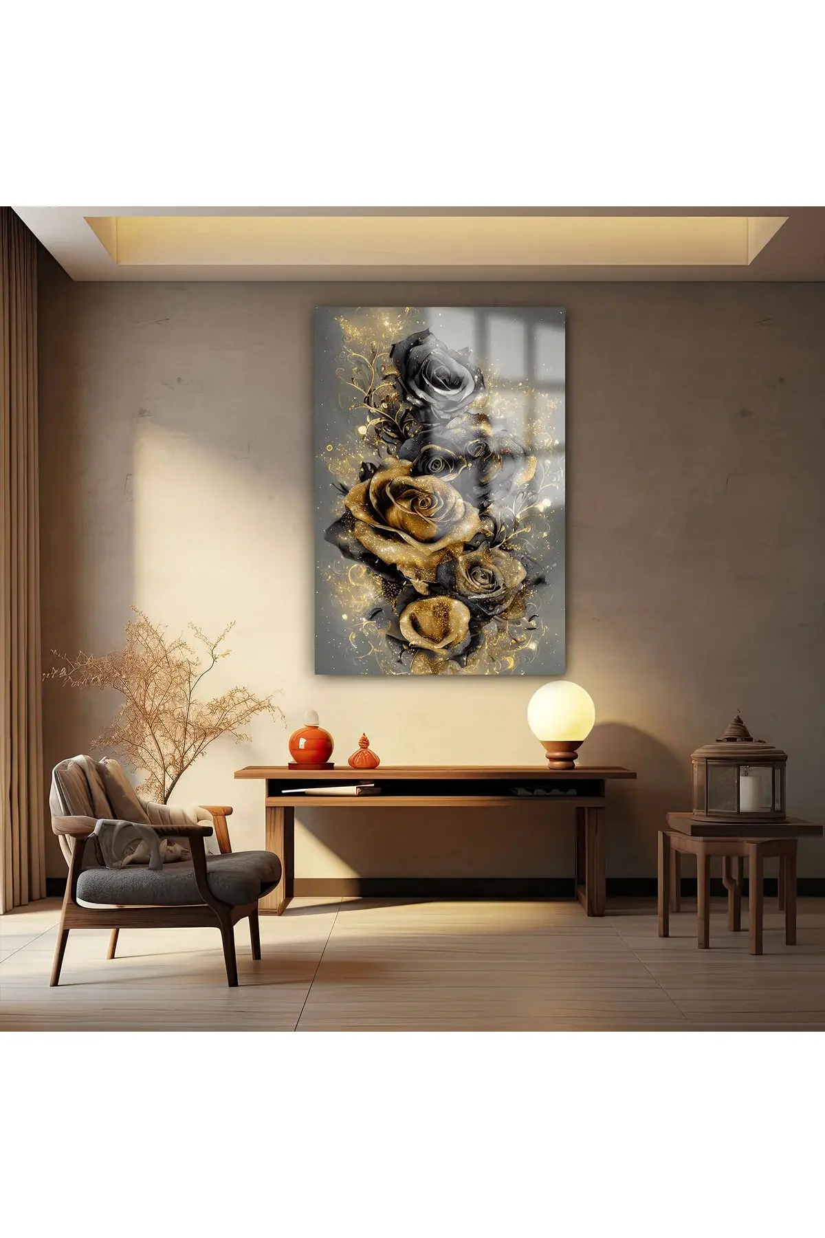 GOLD ÇİÇEK CAM TABLO ULTRA CANLI RENKLİ KIRILMAZ CAM TABLO EV HEDİYESİ OFİS HEDİYESİ