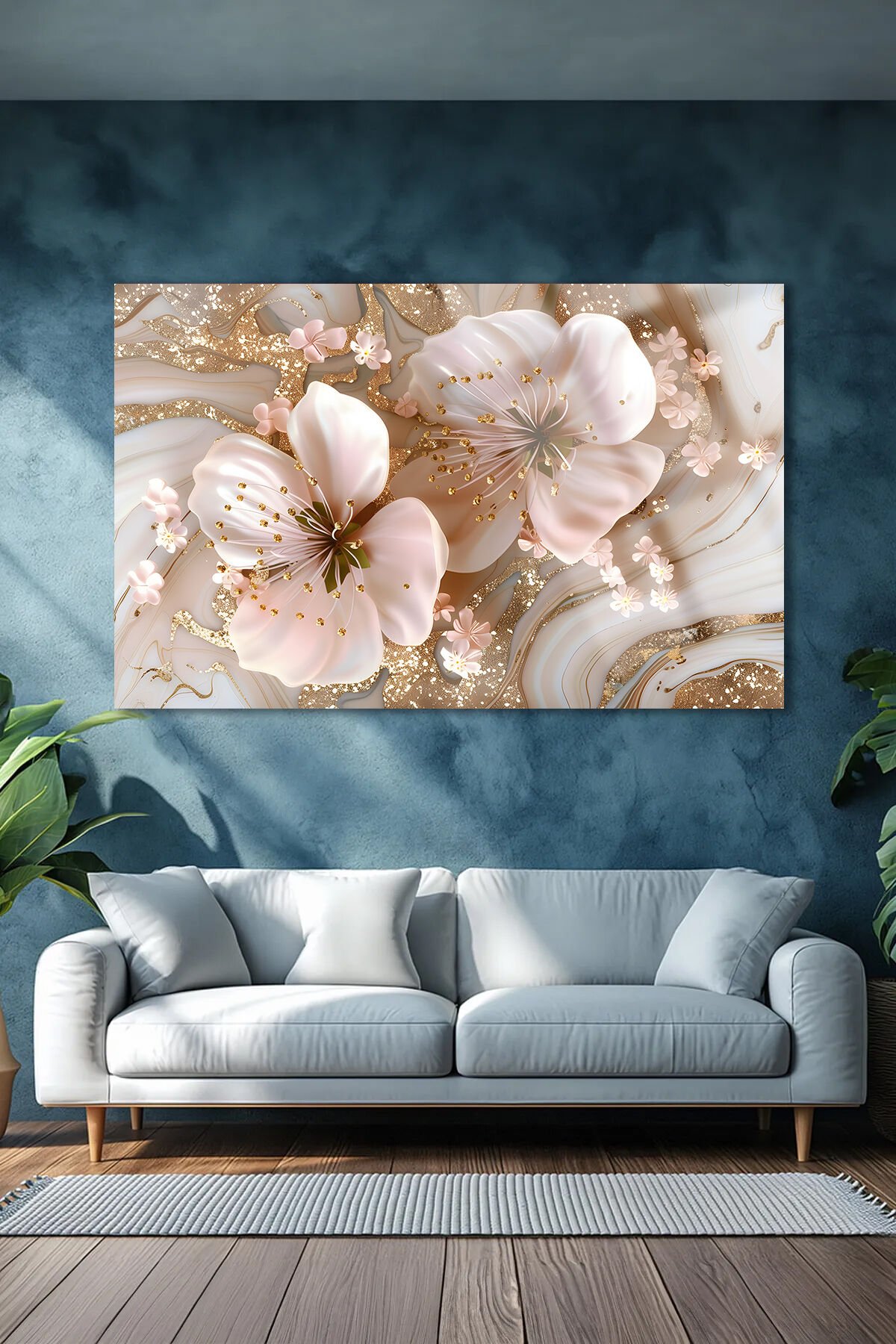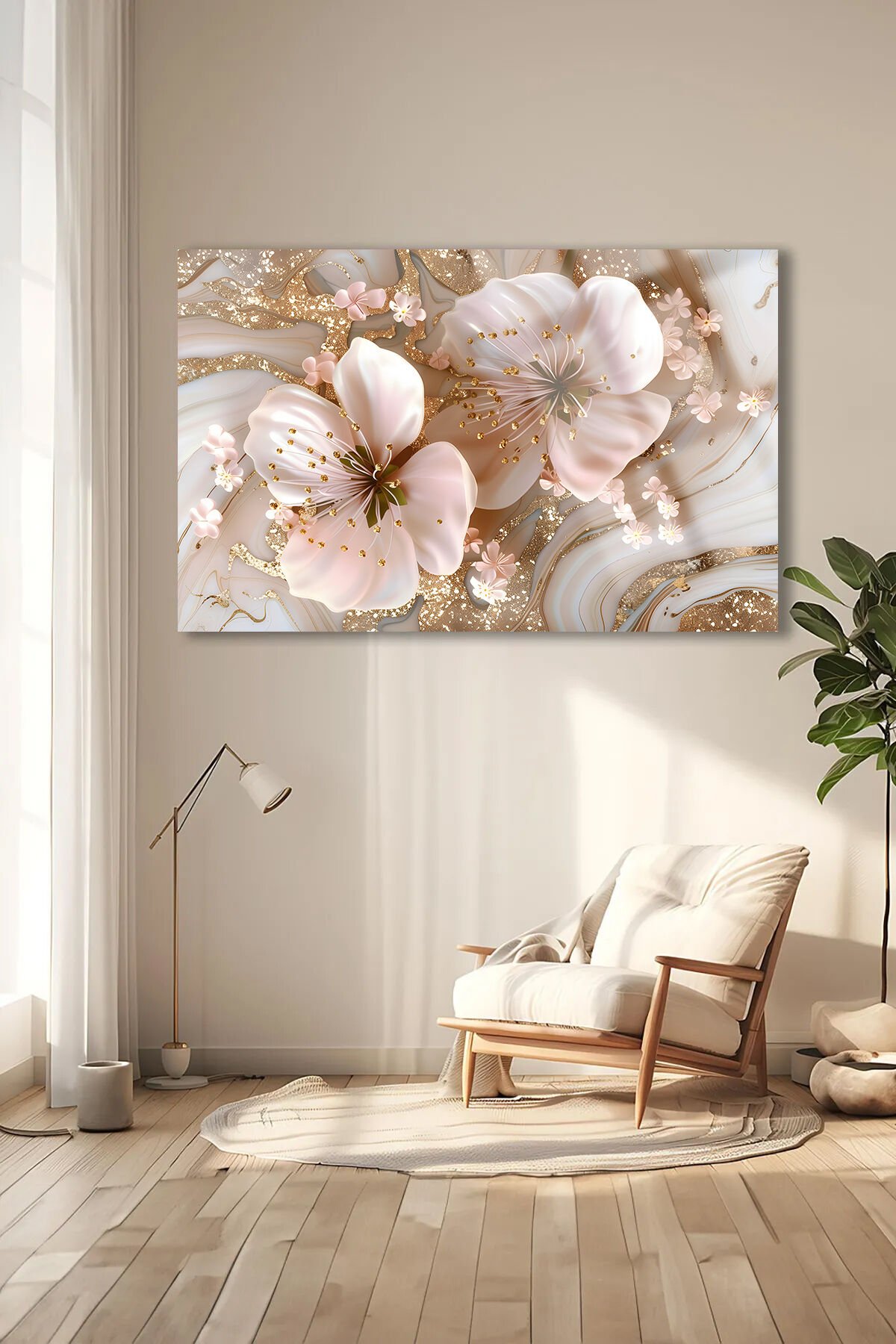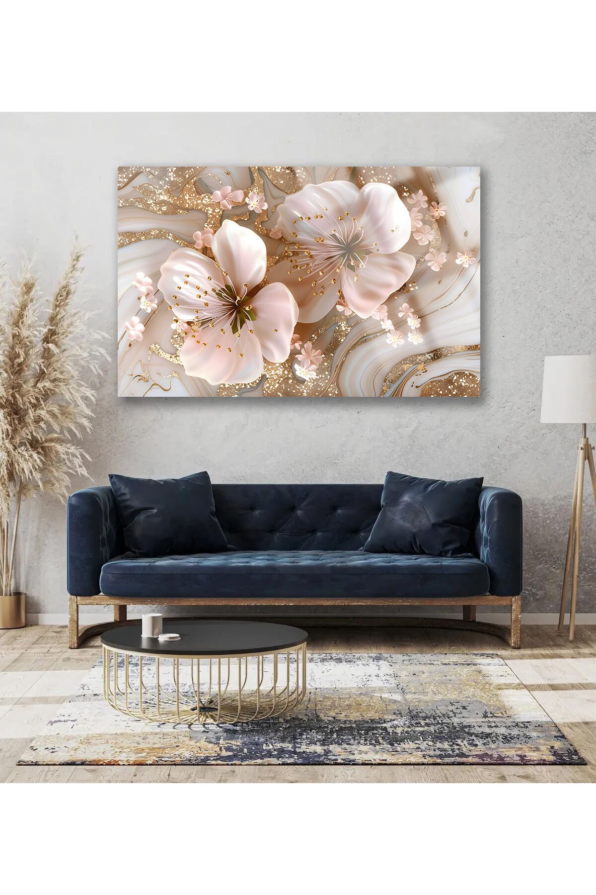 GOLD DETALI BEYAZ ALTIN ÇİÇEKLER YATAY CAM TABLO KIRILMAZ LÜKS CAM TABLO EV HEDİYESİ