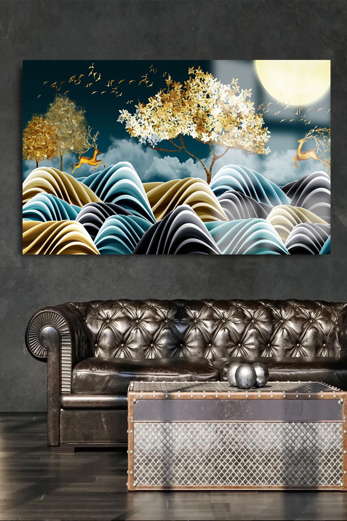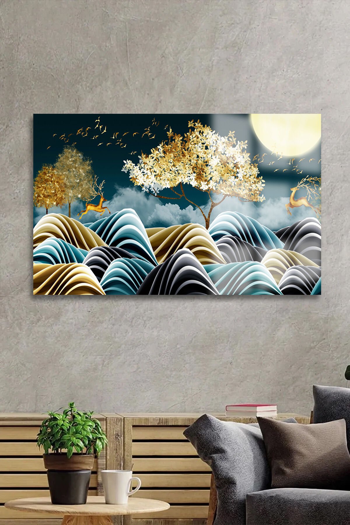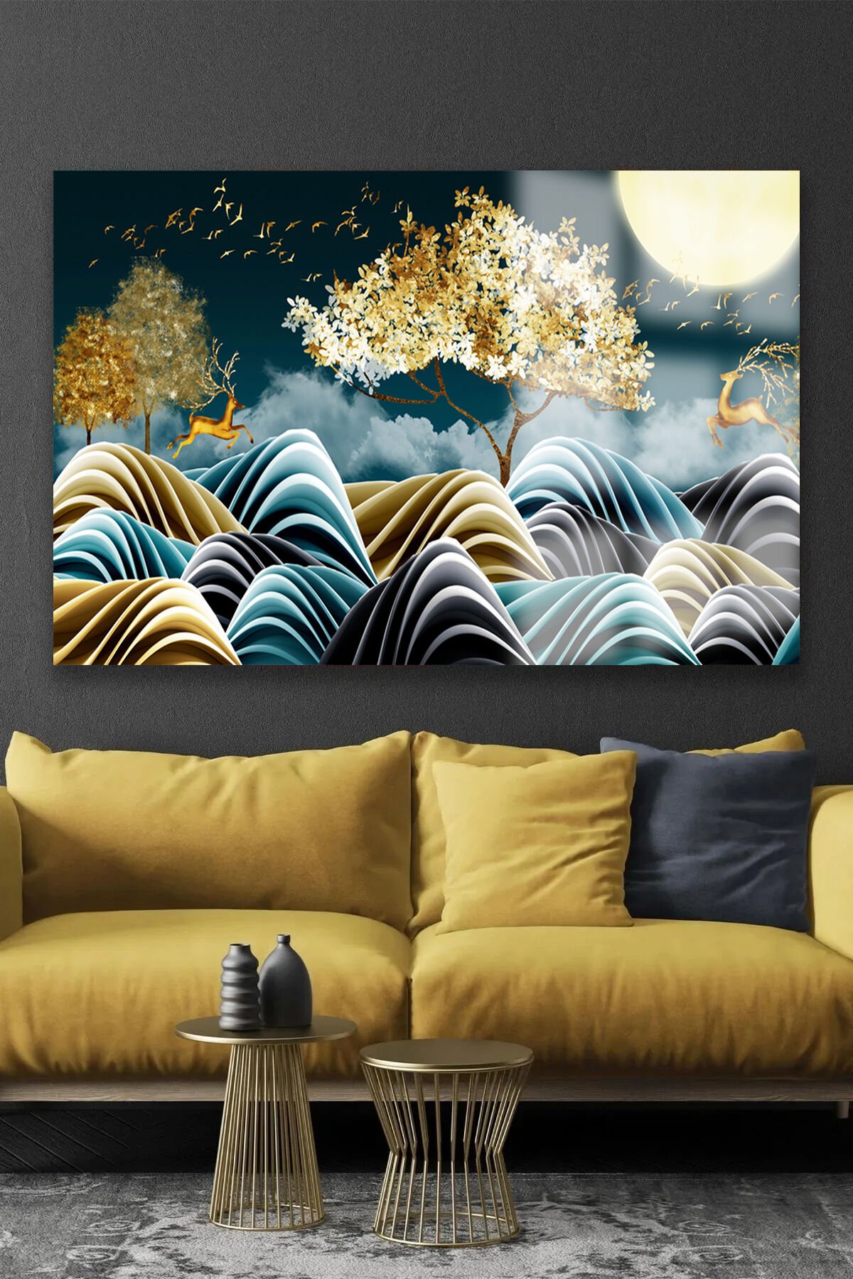 GOLD DETAYLI GEYİK SOYUT HARİKA TASARIM LÜKS KIRILMAZ CAM TABLO 4MM EV İŞ YERİ OFİS HEDİYESİ TABLO Lacivert