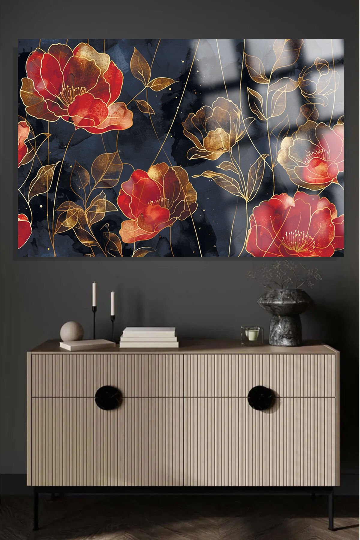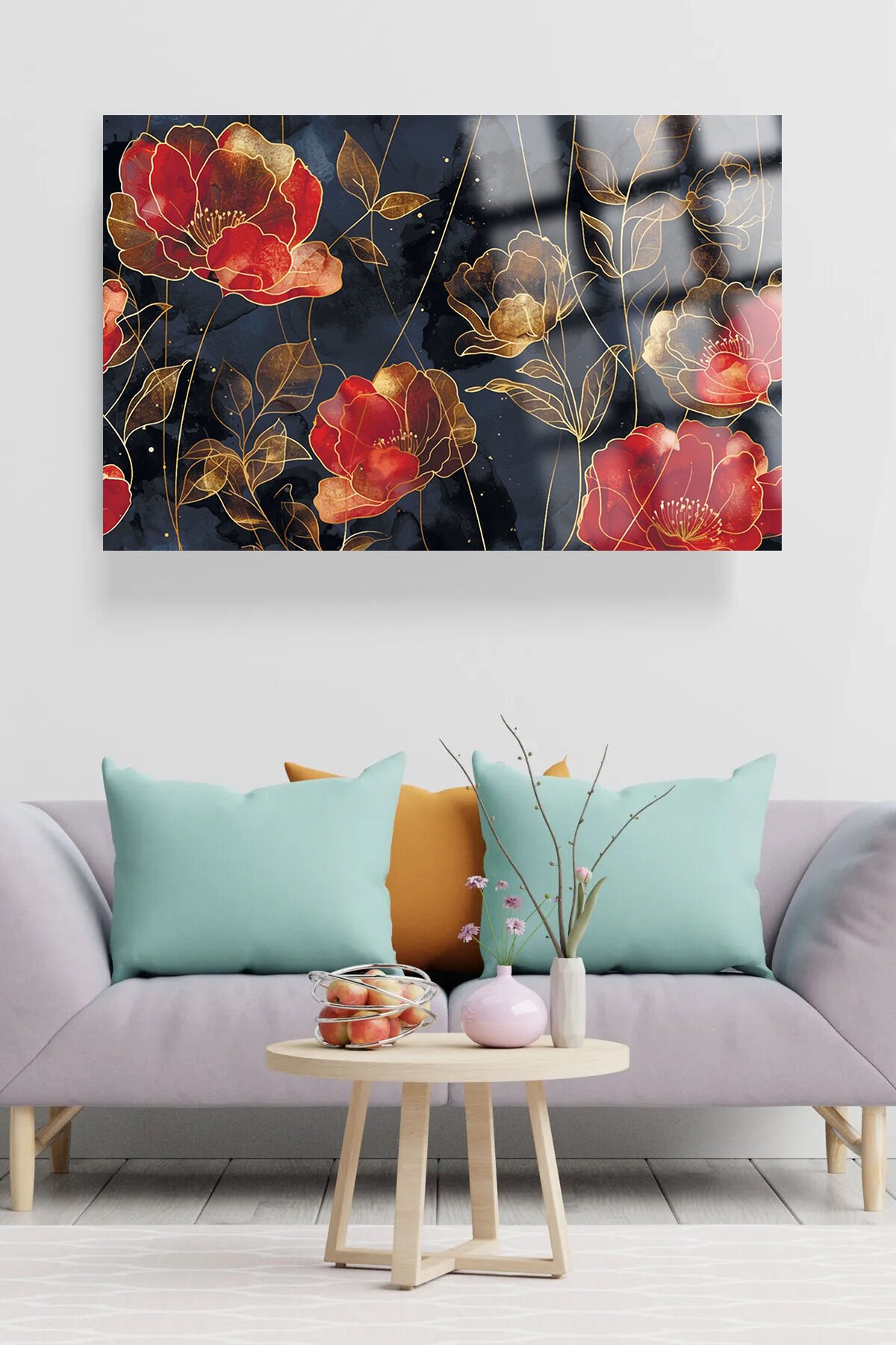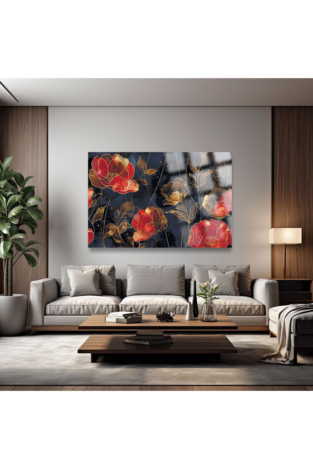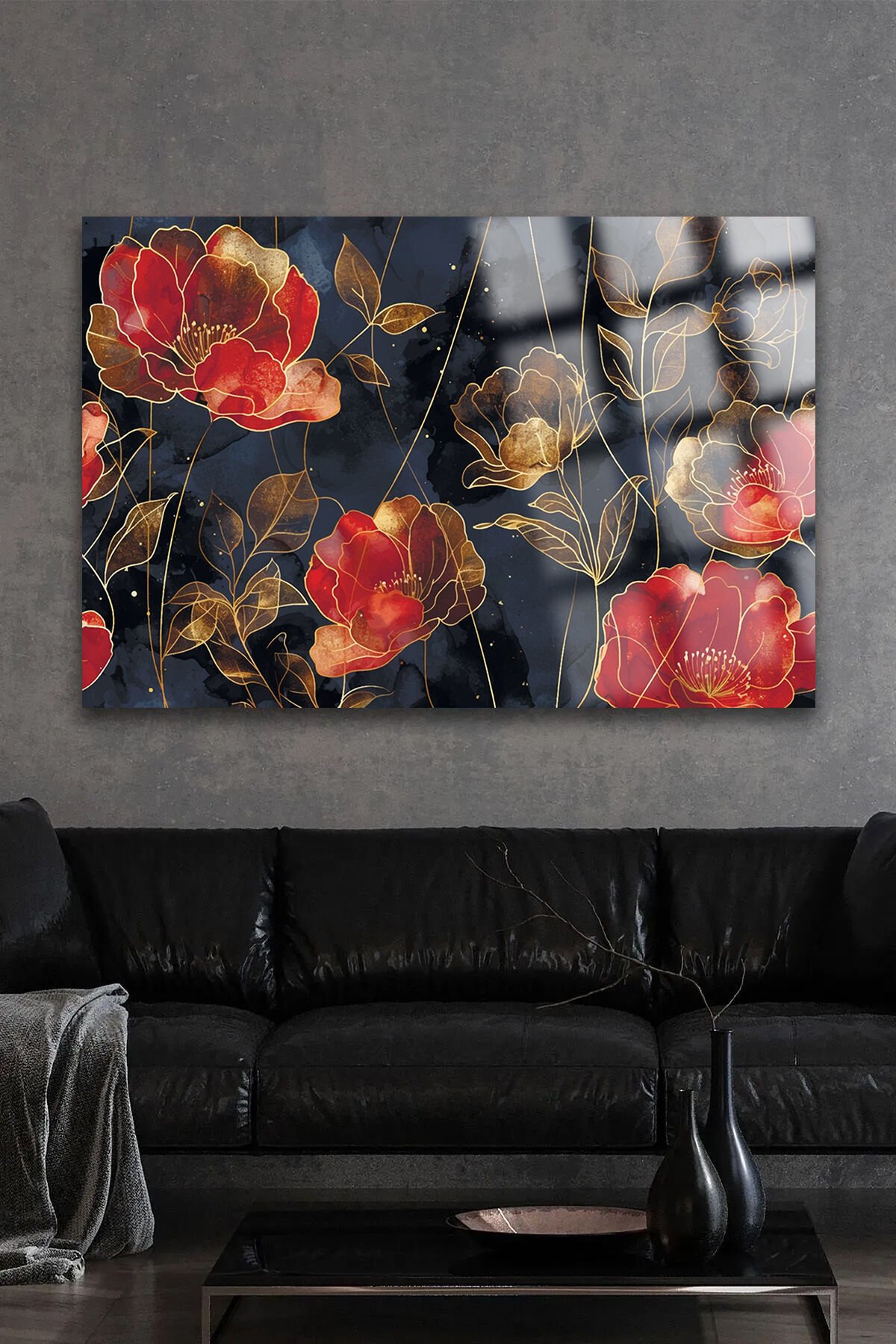 GOLD DETAYLI KIRMIZI RENK ÇİÇEK ULTRA YÜKSEK ÇÖZÜNÜRLÜK KARE CAM TABLO EV HEDİYESİ TABLO