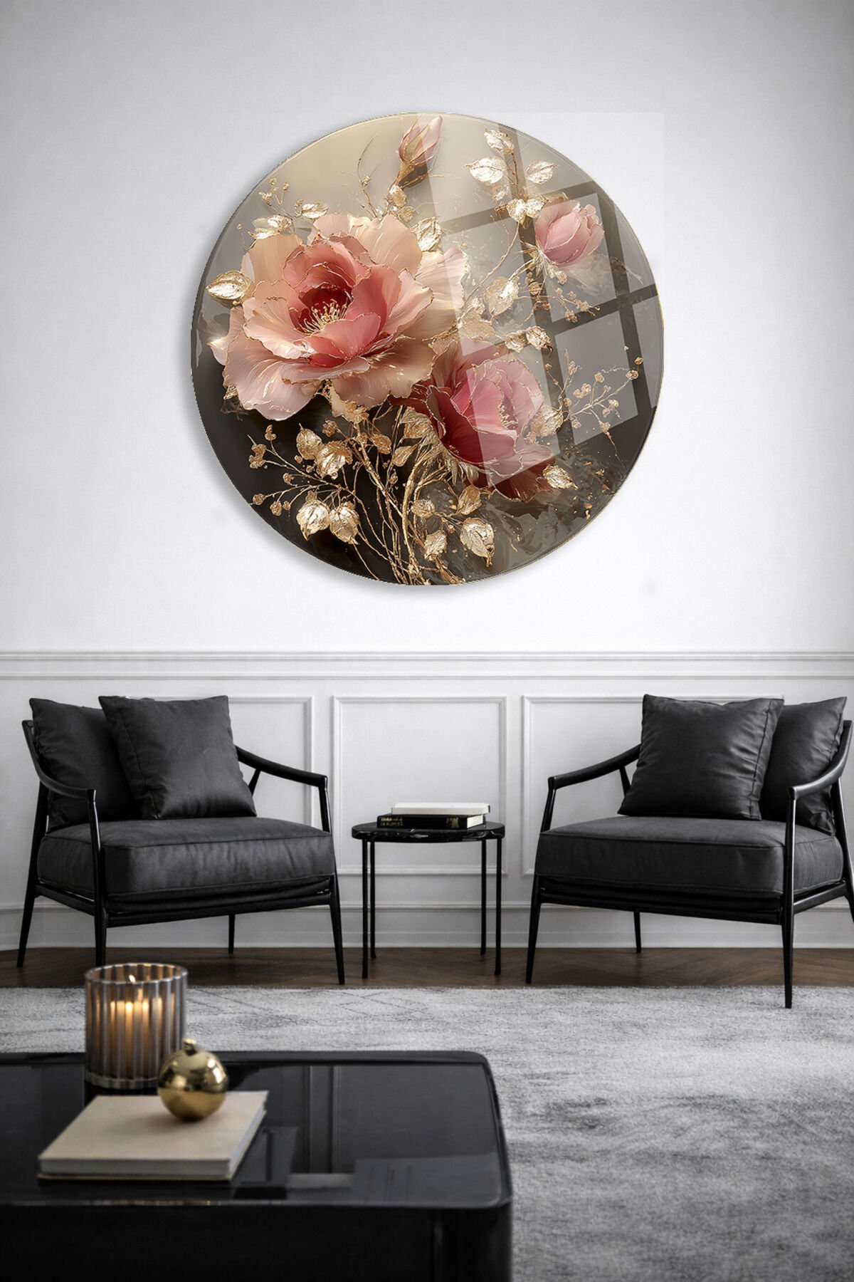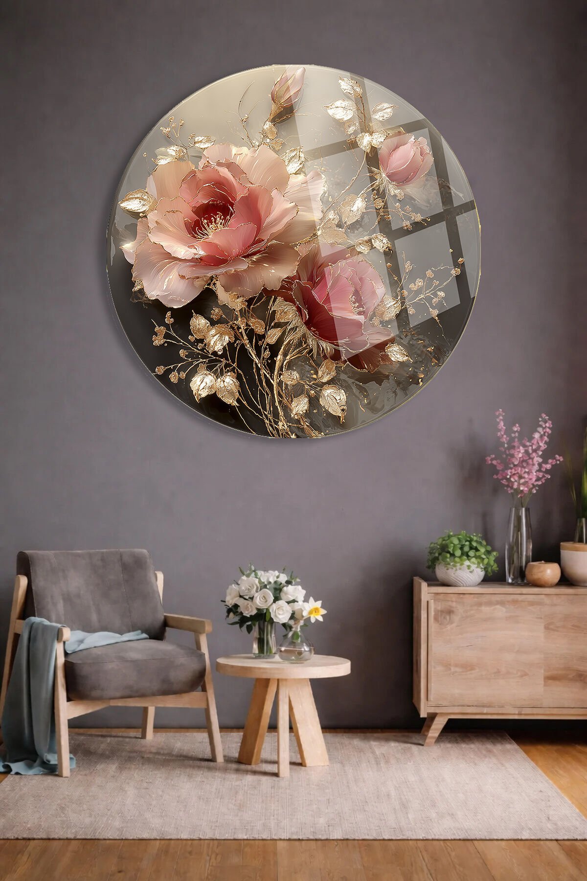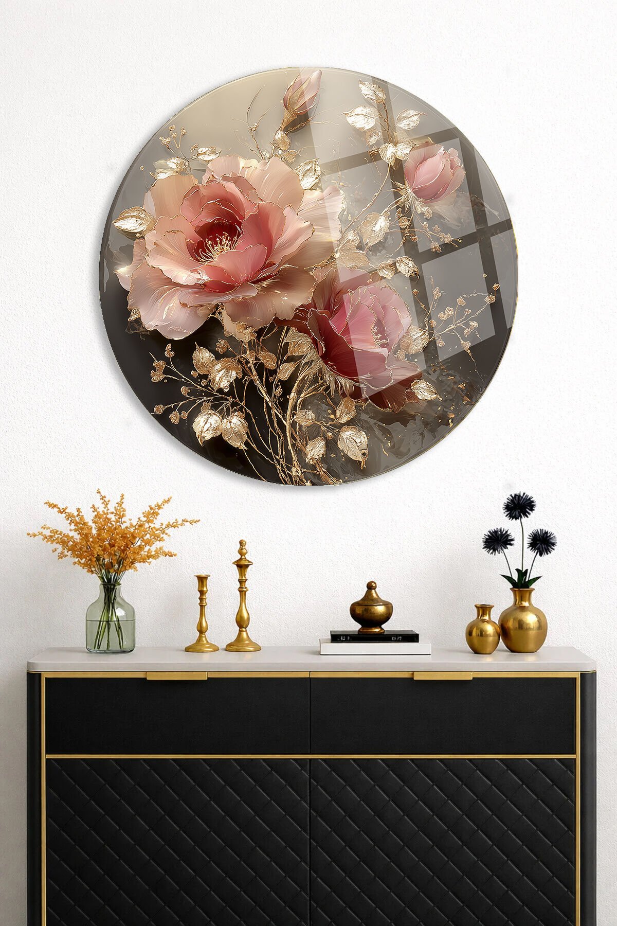 GOLD DETAYLI PEMBE ÇİÇEK MODERN TABLO KIRILMAZ CAM TABLO ULTRA CANLI RENKLER EV OFİS HEDİYESİ Pembe
