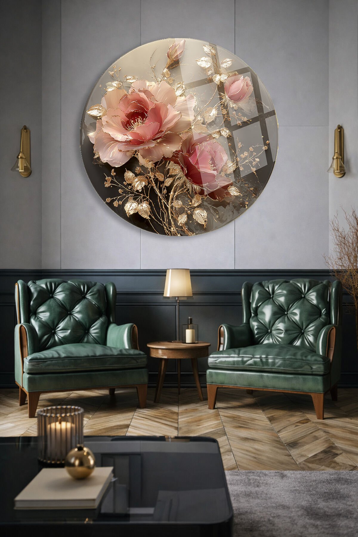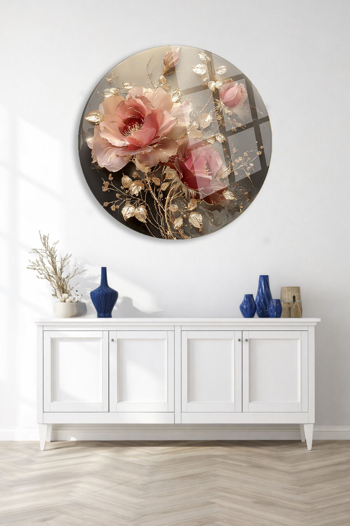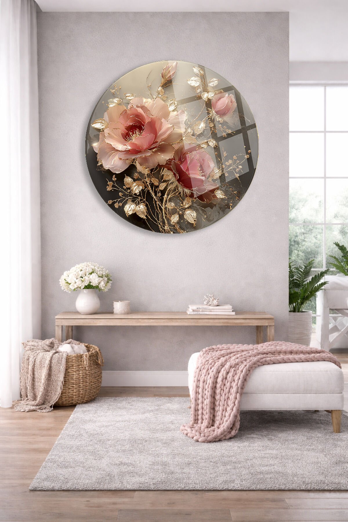 GOLD DETAYLI PEMBE ÇİÇEK MODERN TABLO KIRILMAZ CAM TABLO ULTRA CANLI RENKLER EV OFİS HEDİYESİ Pembe