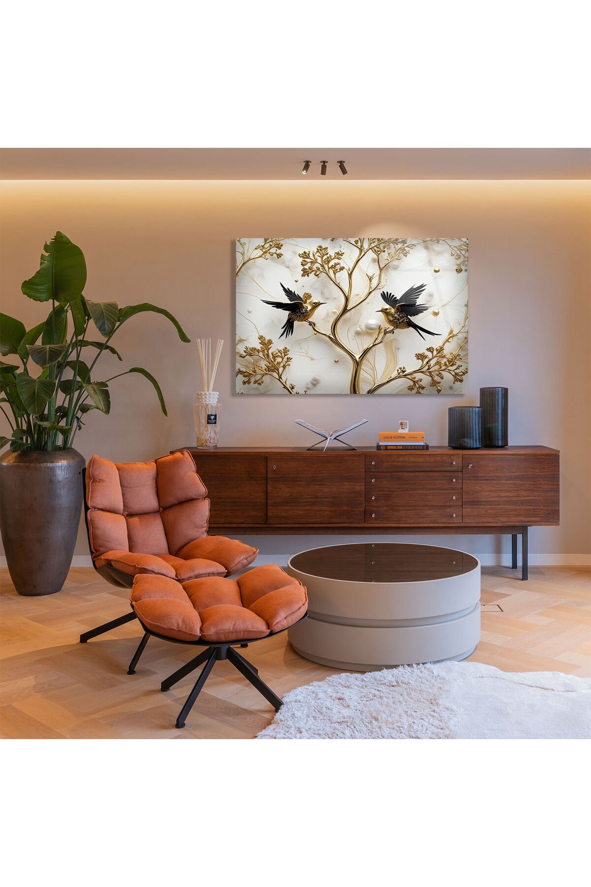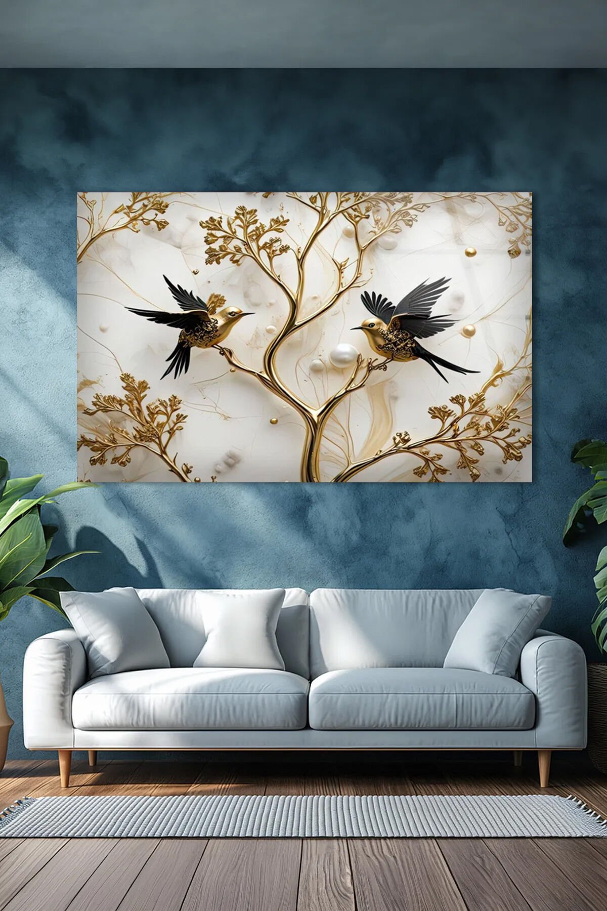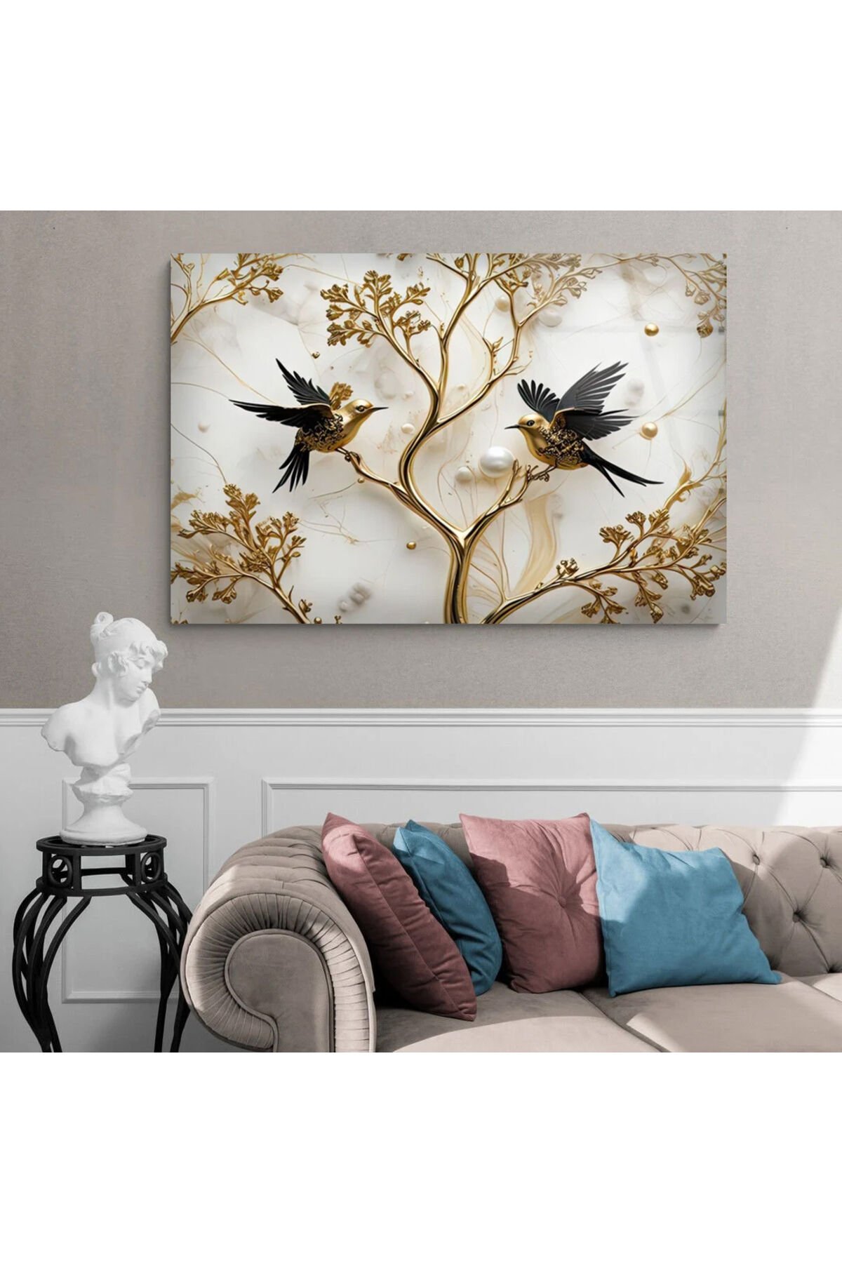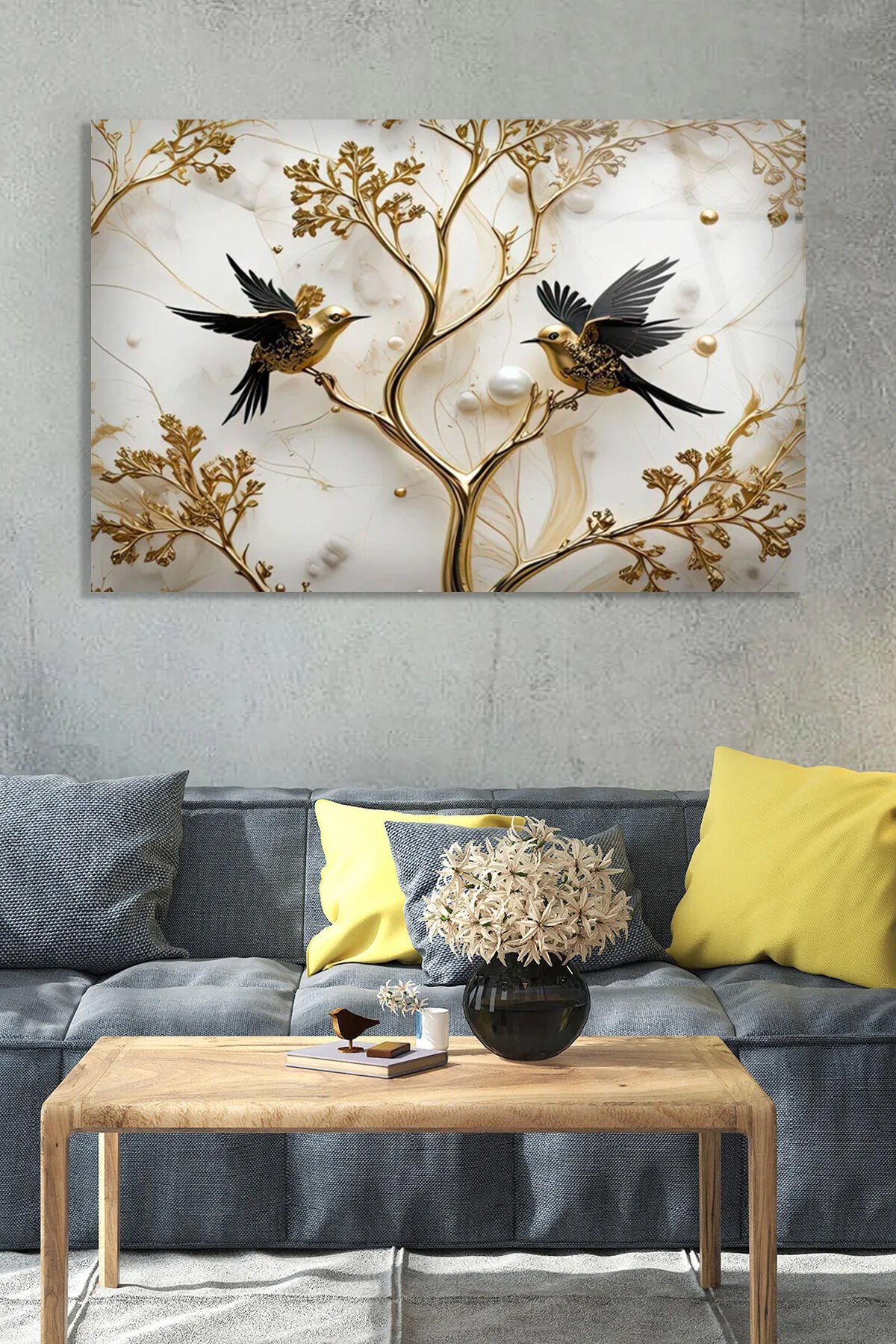 GOLD KUŞ DETAYLI ALTIN KÖKLÜ AĞAÇ YATAY TABLO ULTRA CANLI RENKLİ KIRILMAZ CAM TABLO EV HEDİYESİ