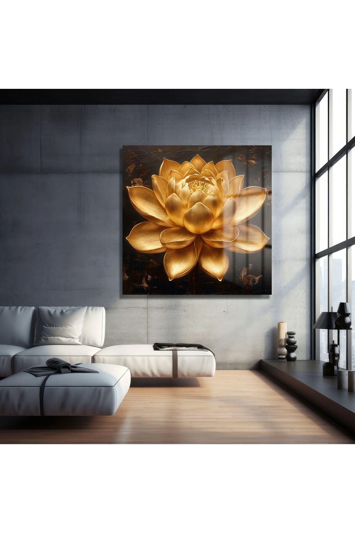GOLD LOTUS ULTRA YÜKSEK ÇÖZÜNÜRLÜK KARE CAM TABLO EV İŞ YERİ OFİS HEDİYESİ SOYUT TASARIM TABLO